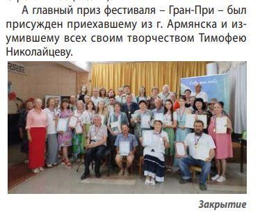 Автор: Тимофей НиколайцевПоясняю для всех удивившихся: то недавнее моё хвастовство газетными полосами – это отголоски международного литературно-песенного фестиваля «Седьмое небо – 2024», что проходил в Крымской Николаевке совсем недавно.