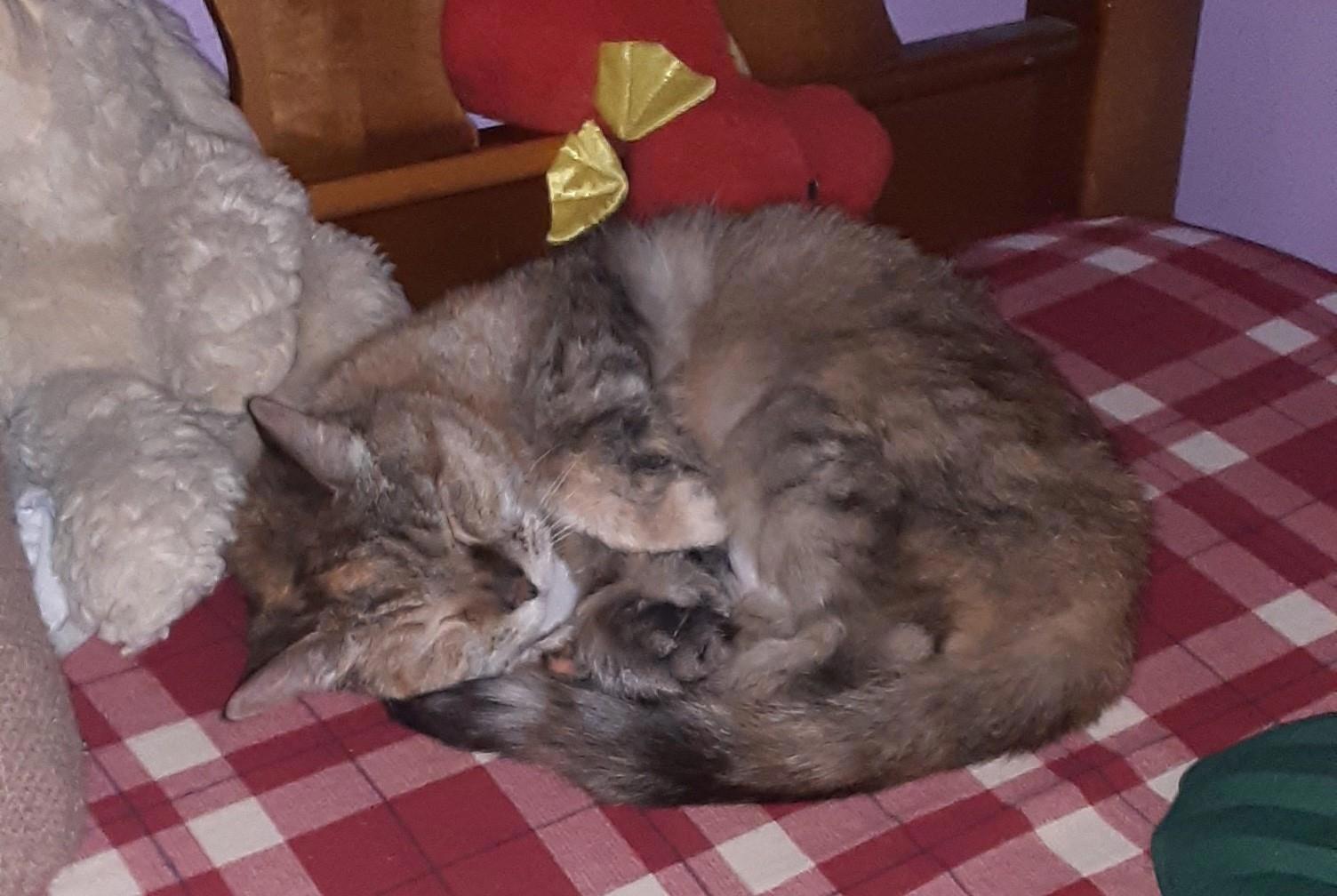 Катя. Она же Катька, Катильда, Катюша-когтюша и т.п. Пятицветка. Удивительно шёлковая! Все, кому удаётся поглядить, удивляются, какая мягкая у неё шерсть.