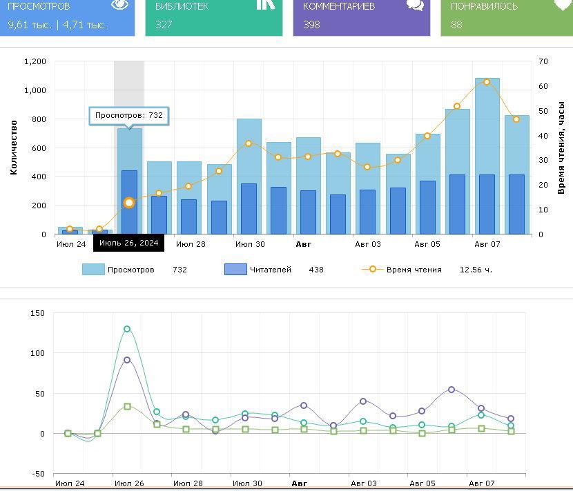 . Три аудитории читателей одновременно ломанулись в статистику автора и соавторов. Кстати, жаль,что нет отбора "кроме выбранных". Тогда бы было сразу видно на сколько лучше читают то, что было написано не в соавторстве после прихода соавторской аудитории. И да, теперь это стало аудиторией всех троих.