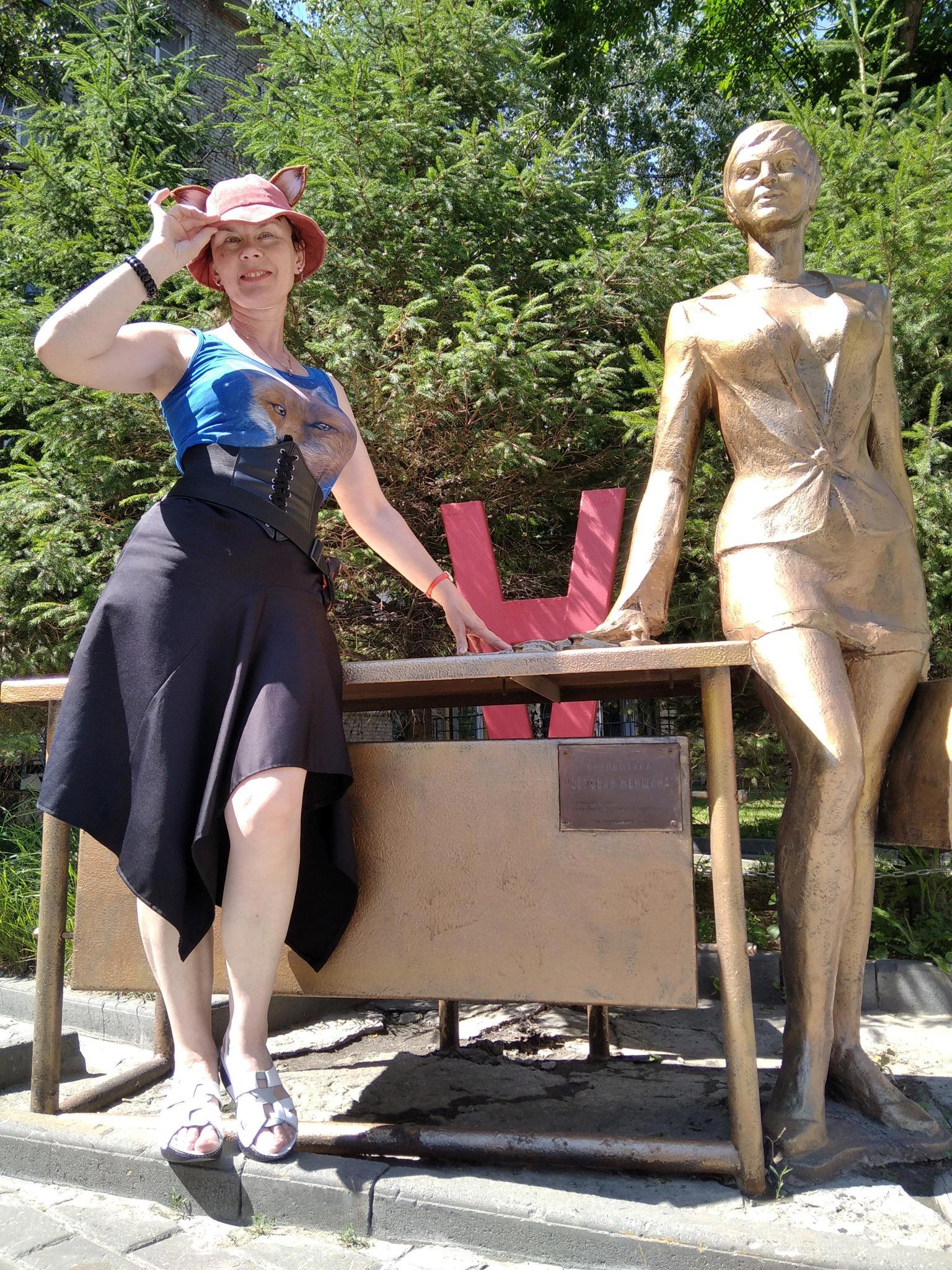 запечатлелась рядом с оригинальной скульптурой под названием «Деловая женщина» и…в парк.