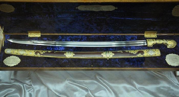 А это шашка Сталину от узбекского народа в честь 20-летия Узбекской ССР - то есть подарена в 1944 году, еще война идет. В устье ножен вмонтирован бриллиант, на центральной табличке гравированная дарственная надпись и стихи узбекского поэта Алишера Навои: «Кто хочет очистить мир от зла, вступает в битву тот за добрые дела, и меч в его руках безудержно суров, не знает никогда пощады для врагов».