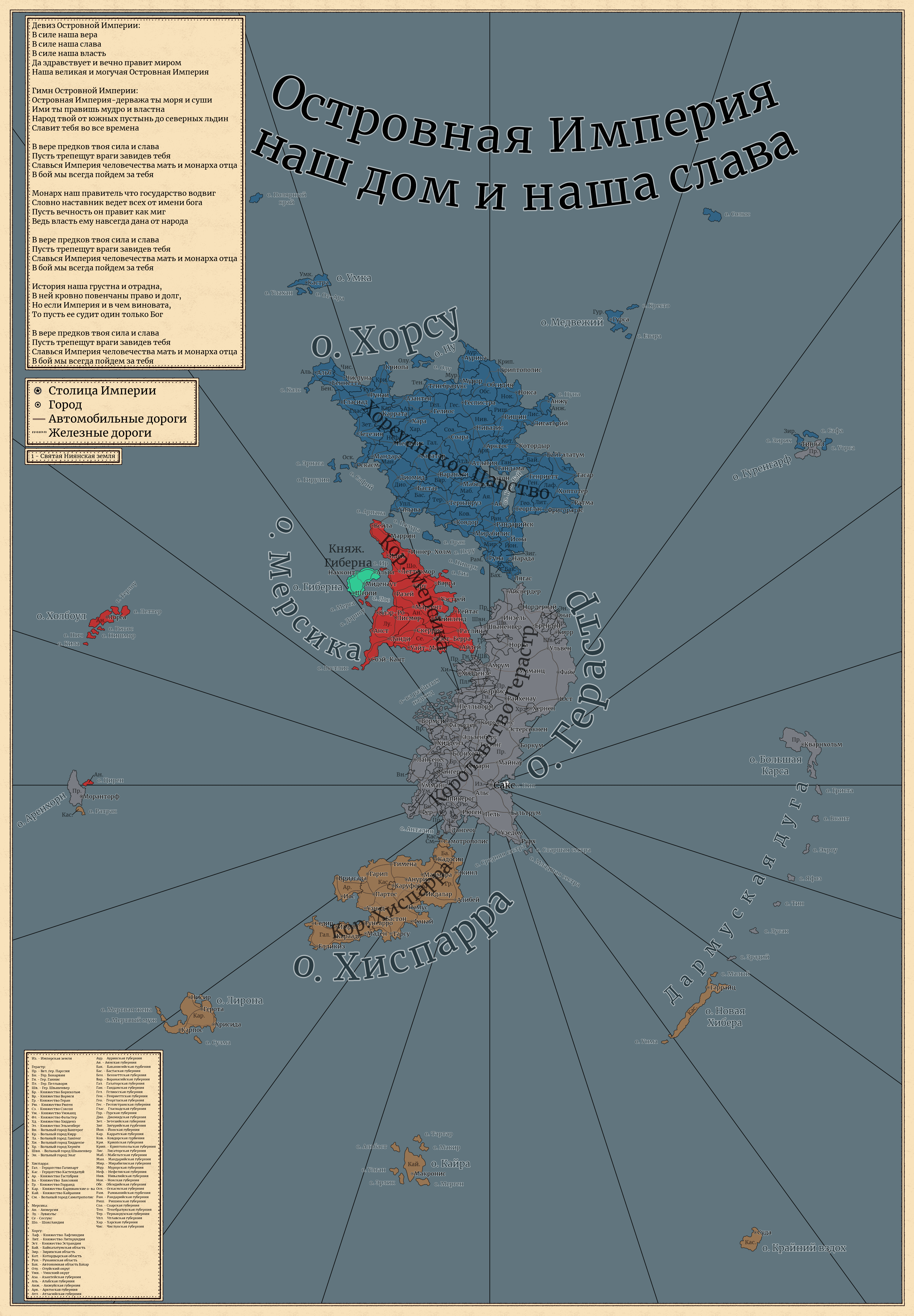 На данной карте представлен политический конструкт Островной Империи. Уже впервые взглянув на карту, можно прикинуть расклад сил в государстве.