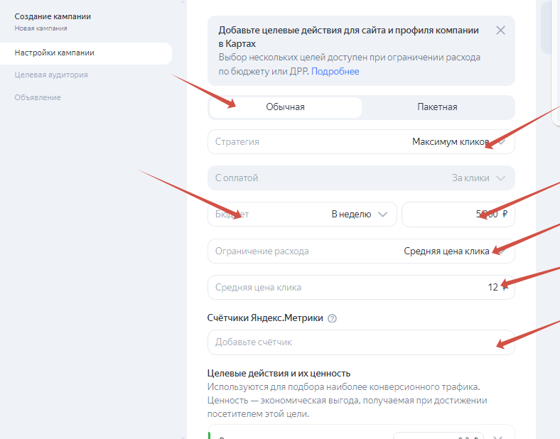 Ниже идёт очень важная кнопка задания типа стратегии: с максимумом кликов или максимумом конверсий. Если включить оплату за клики, деньги с вас будут сниматься за любые клики по вашей рекламе, в том числе и ради любопытства и чтением половины главы. Если включить оплату за конверсии, то Яндекс с вас будет брать деньги только за целевые действия, заданные в Яндекс Метрике, то есть за конкретные конверсии, то есть, например, покупку книги.