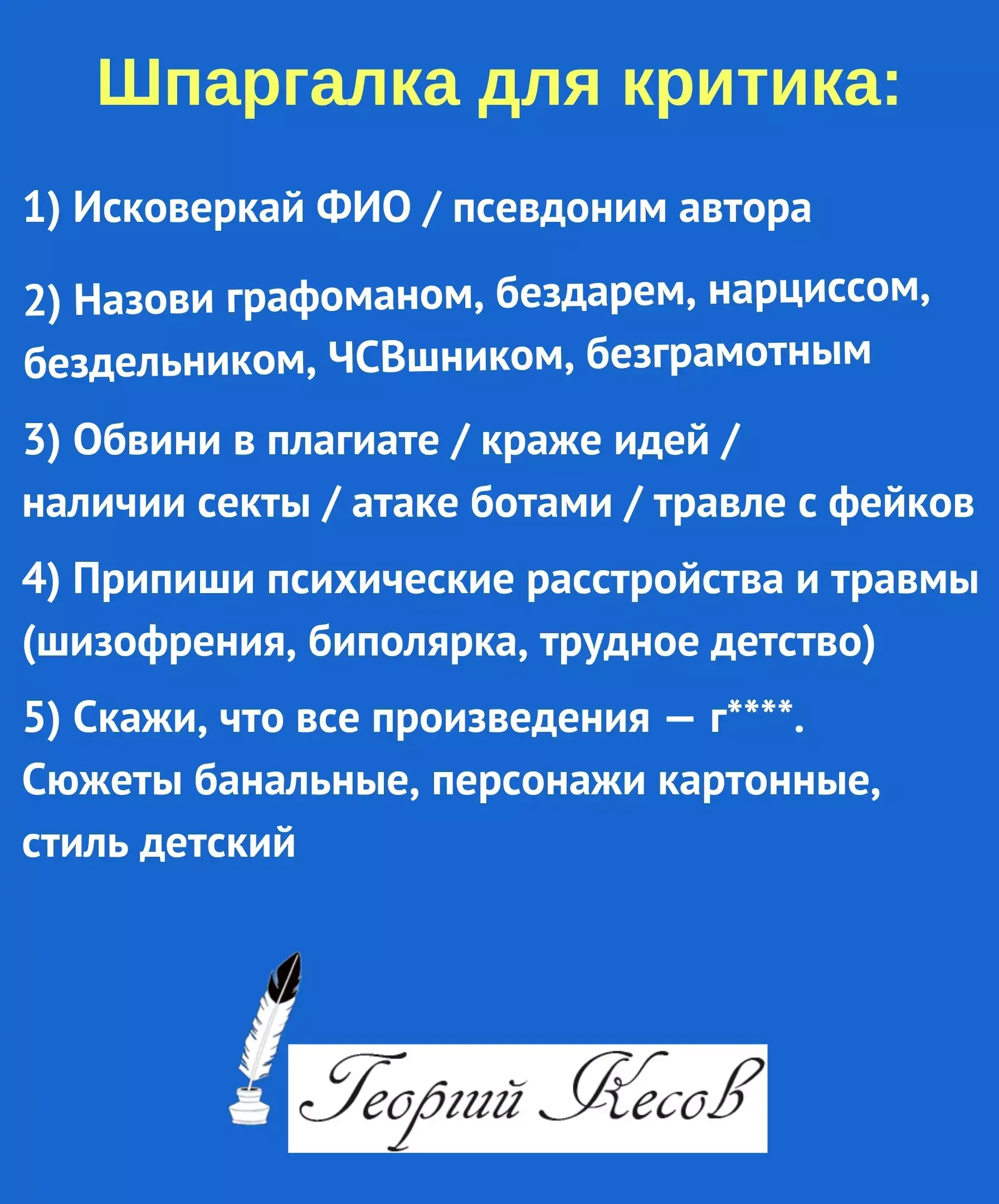 Автор: Георгий КесовПредставляю вам шпаргалку для интернет-критиков! В ней я собрал популярные замечания, обвинения и оскорбления в адрес писателей.