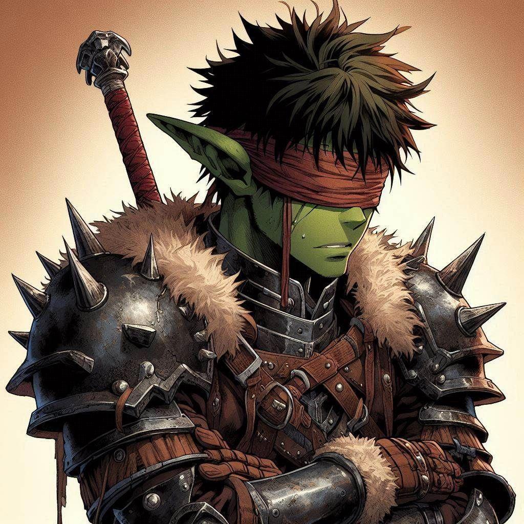 Парнишка-орк был одет в средние доспехи с шипастыми наплечниками и держал в руках полуторный меч. Черноволосый с острыми, как у эльфа ушами, видимо, полукровка. Хорошо сложен атлетически. В целом он отличался от своих соплеменников не только ушами, и причёской, которой все остальные орки предпочитают не заниматься, брея голову налысо или оставляя только «конский хвост», но и габаритами. Несмотря на то, что сложен парнишка-орк был неплохо, можно сказать даже отлично, он был меньше остальных орков. Больше походил на эльфов, только зеленокожий. В его внешнем виде было только одно «НО». На его глазах была красная повязка, через которую он врядле что-то видел. «Прям ниндзя-черепашка! Как его там звали? Ну, с красной повязкой! А! Рафаэль! Точно! Панциря на спине только не хватает». Максим, глядя на это, не мог поверить, что с завязанными глазами можно вытворять такие финты и пируэты, и при этом не попадать под удары голема.