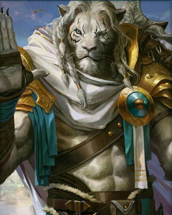 Макс, Карх и Сакай обернулись и оторопели. Перед ними стоял сам Владыка Леогатто Кайзер в сопровождении Ягмилая и Такшина. Огромный белый антропоморфный лев, ростом с кунари. Броня его выглядела как у варваров из книг, которые читал Максим. Всё было сделано из кожи. Наручи, набедренники, повязки, перевязки и ремешки. Наплечники были выкованы из золота и обрамлены разными узорами. Белый длинный плащ и тёмно-голубая набедренная накидка. К броне в некоторых местах были привязаны или намотаны ленточки цветов плаща и накидки. Его левый глаз был перечёркнут шрамом. А в левой руке он держал, положив на плечо огромный топор-косу с лезвиями по обе стороны длинного древка.