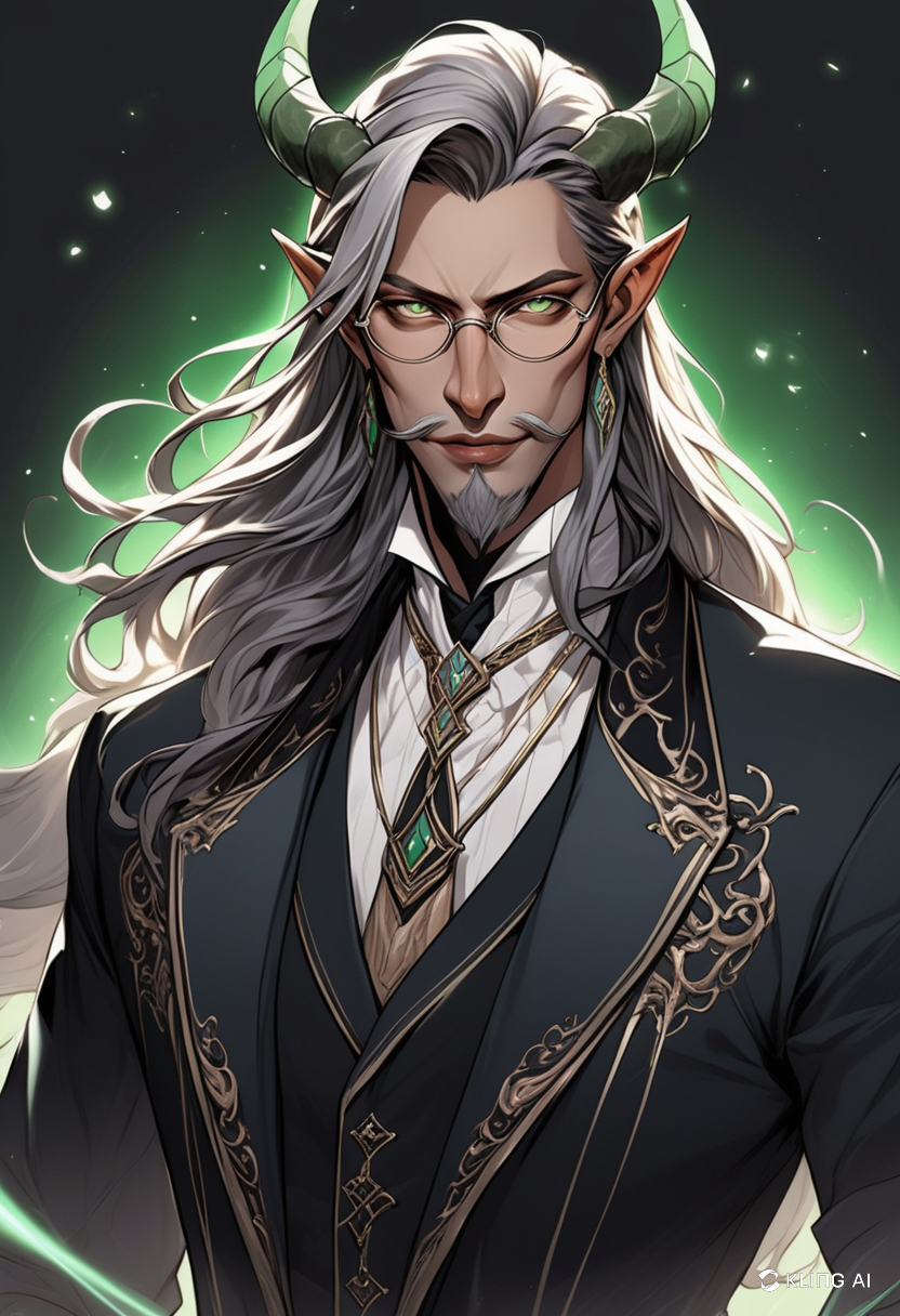 Высокая фигура дворецкого, облаченная в нарядную тёмно-серую форму, смотрелась величественно. Отделанные золотыми вышивками фрак и жилетка. Белая рубашка. Чёрный с золотом галстук, украшенный несколькими изумрудами. Невозможно было не подумать о том, как он заботится о своей внешности и ухаживает за собой даже в самые неподходящие моменты. Такшин тоже демонит. Острые черты лица, серебристые роскошные волосы и изумрудные рога. Аккуратные серебристые усики и бородка. Острые уши, как у эльфов, увенчанные золотыми серьгами с изумрудами. Глаза дворецкого, ярко-изумрудные, прикрытые очками в тонкой оправе, словно горели благоговением и неподдельной преданностью к своей работе. Всё это придавало ему особую изящность.