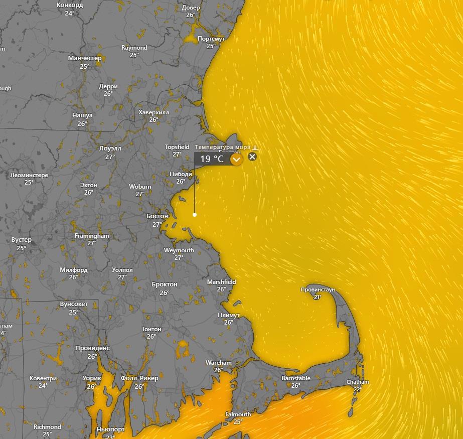 Если говорить о западном побережье США, то там ситуация ненамного лучше. В районе Бостона +19, широта 42 градуса, та же самая, что и у абхазского Сухуми.