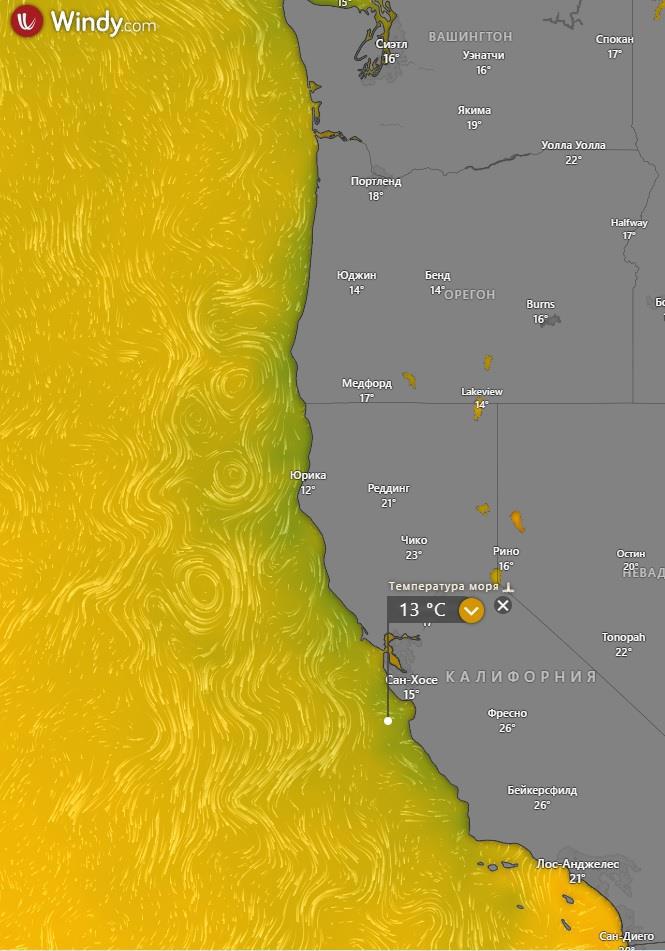 Широта Сан-Франциско 37 градусов, такая же как и у солнечного города Афины. И всего лишь +13 градусов. И практически всё западное побережье такое. А в холодный период года вода там, соответственно, на несколько градусов холоднее.