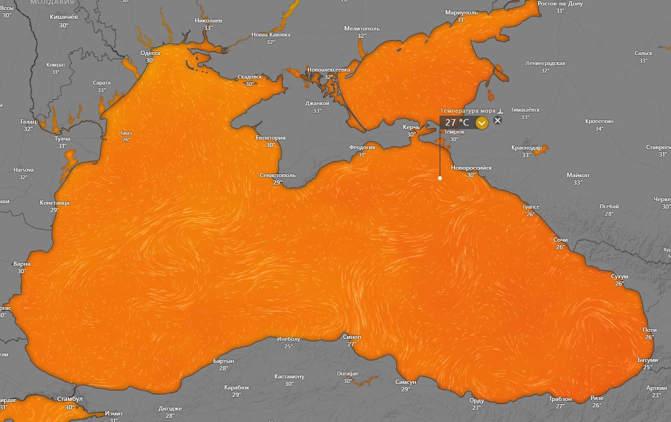 Температура в Черном море практически одинакова и находится в районе +27 градусов.