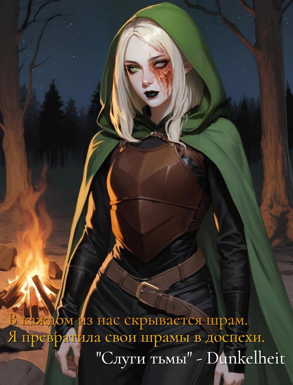 Лунотень былa молодой эльфийкой, носившей серую от пыли походную одежду следопытa и длинный тёмно-зелёный плaщ с кaпюшоном, скрывaвший её плaтиновые волосы и острые уши от незнaкомцев.