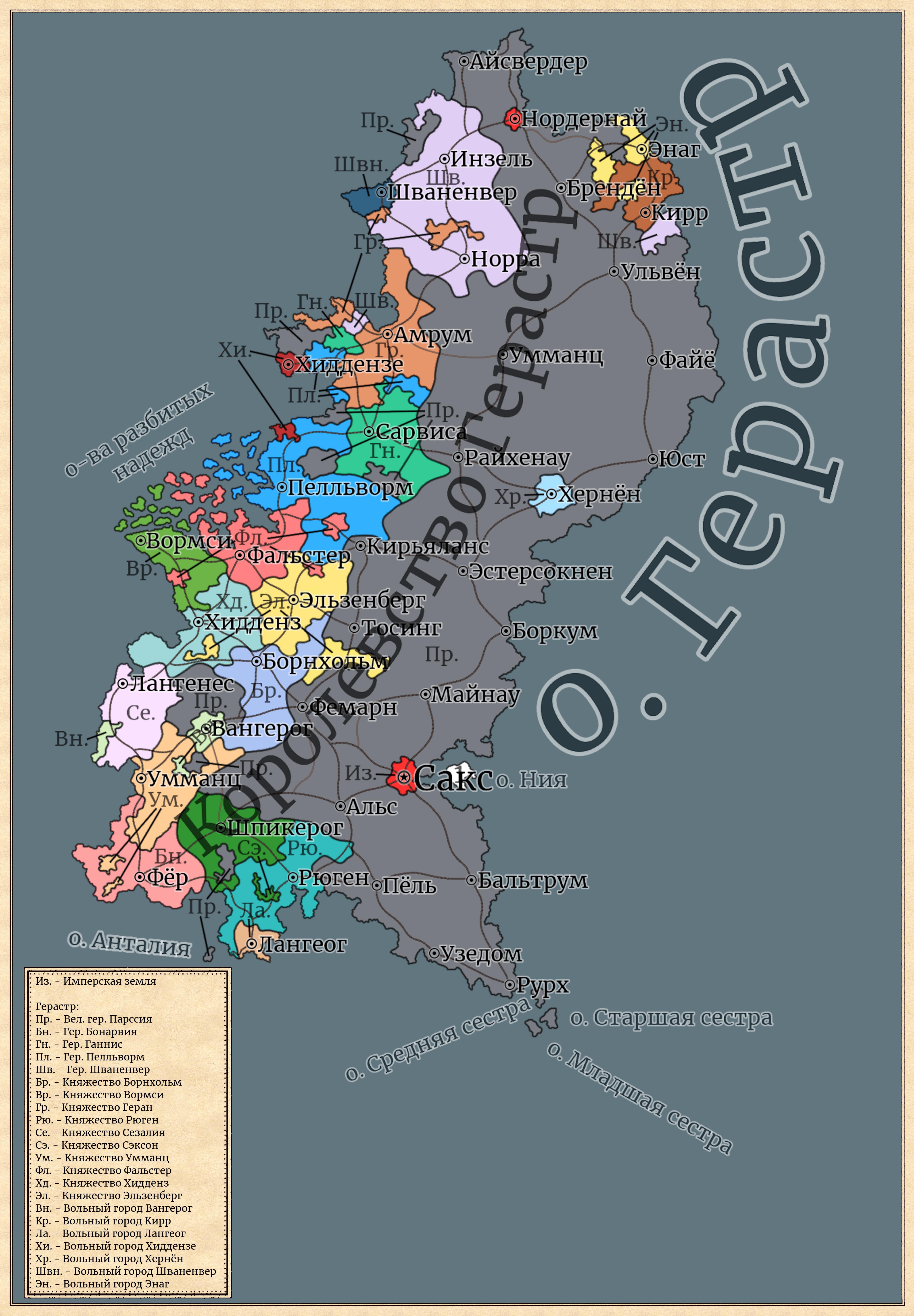 Как видно, остров разделен почти на пополам, с севера на юг. Причины оного кроятся в истории и культуре. Запад герастра никогда не славился единством, предпочитая быть разделенным на мелкие государства. Учитывая их местоположение и те ресурсы, которыми они обладали, подобное устройство существовала без особых проблем. Торговый уклад запада, что стоял на самых загруженных торговых путях, поощрял индивидуализм и непохожесть, отчего каждый из правителей особо никогда не думал об истинном единстве народа острова, ограничиваясь кратковременными союзами и коалициями, что часто перетасовывались между собой.