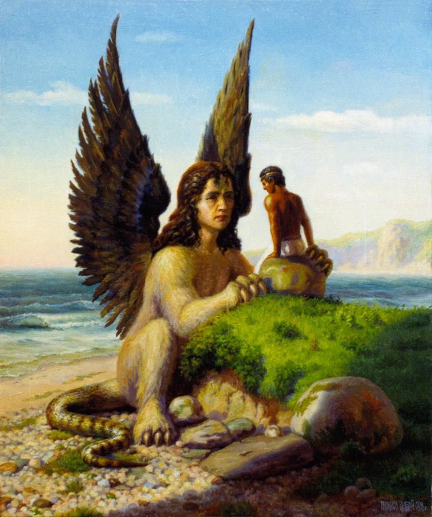 - Сфинкс и Ойдип: В древнегреческой мифологии сфинкс, который имел тело льва, крылья орла и лицо женщины, терроризировал город Фивы, задавая путникам загадки и убивая тех, кто не мог их разгадать. Ойдип разгадал загадку сфинкса, и чудовище в отчаянии бросилось с утёса. Эта легенда показывает роль мифологических существ в качестве хранителей и испытателей.