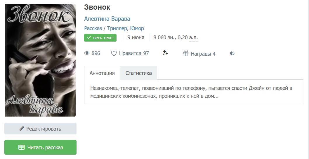 Автор: Алевтина ВараваОзвученный "Звонок" ждёт своих слушателей в надежде на лайк) А то его мамочка - текстовая версия, уж к сотне лайков подбирается, а он, такой живенький, антуражный, с эффектами, кукует с неполным полтинником в тоске и учинении...