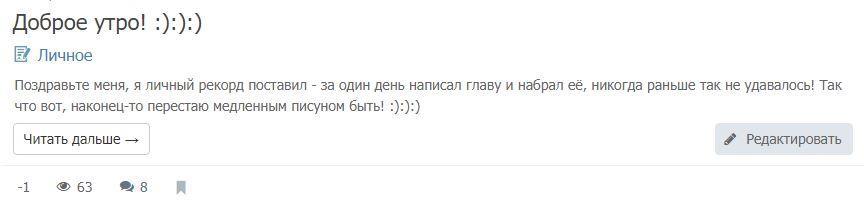 З.Ы. Тут, кстати, кто-то пенял, что я не пишу позитив. Писал, если кто не заметил. Итог - всего восемь комментов (и то поздравить никто не зашёл) и отрицательная репа (хотя могли бы хоть раз не минусовать, радость от личного праздника не портить! Эх, люди-люди...). Всё, больше никакого позитива, на фиг надо!