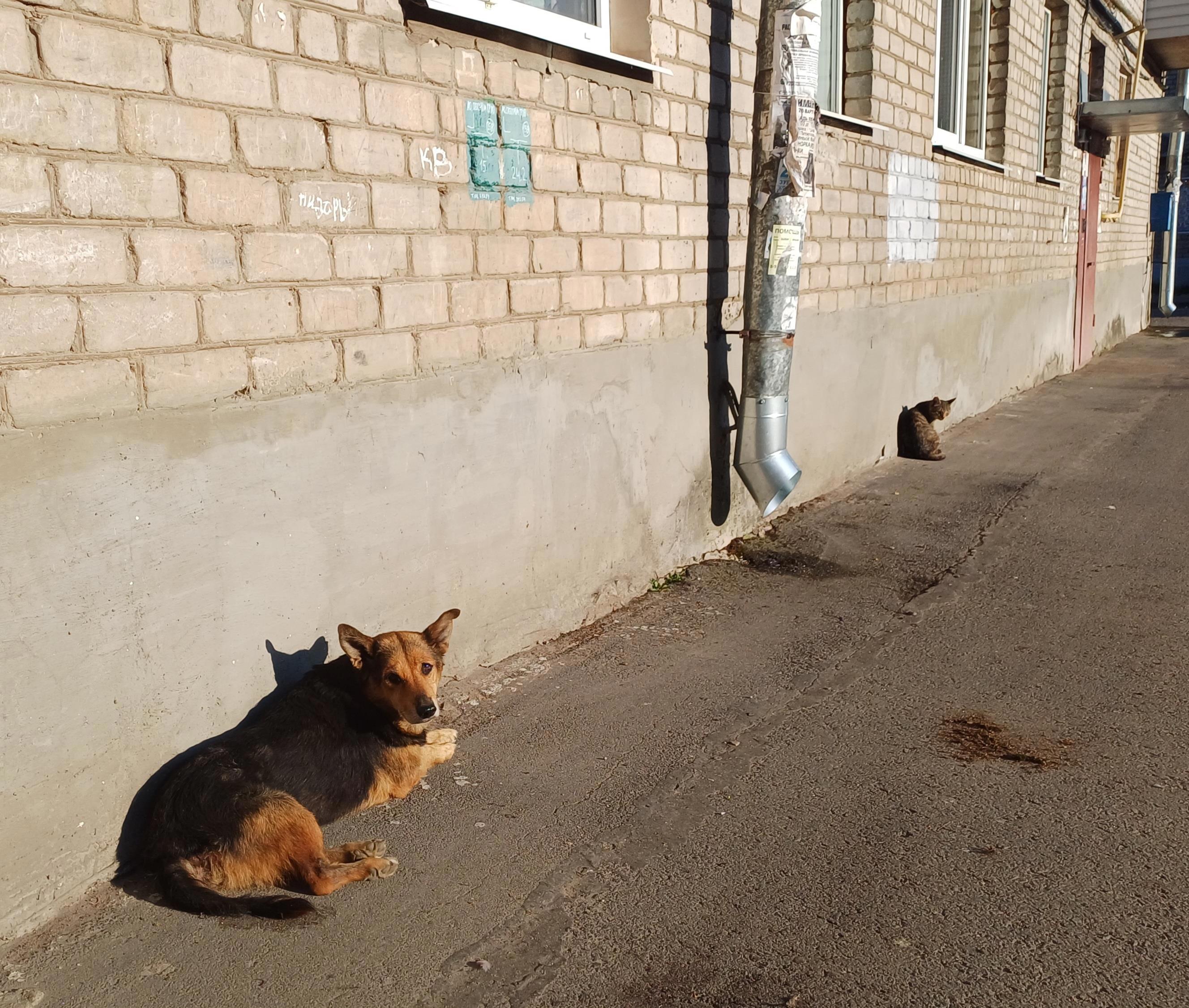 Котик местный, чаще всего с утречка на припаркованных машинах спит, а собакен вроде как из соседнего двора - но вижу его регулярно, по утрам приходит с дворниками, которые убирают мусор.