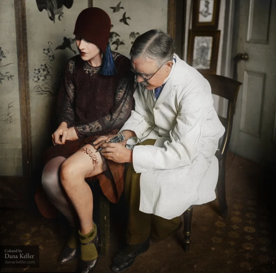 Что мы тут видим? На фото Джордж Барчетт, легендарный "Король татуировки" за работой. Англия. 1930 год.