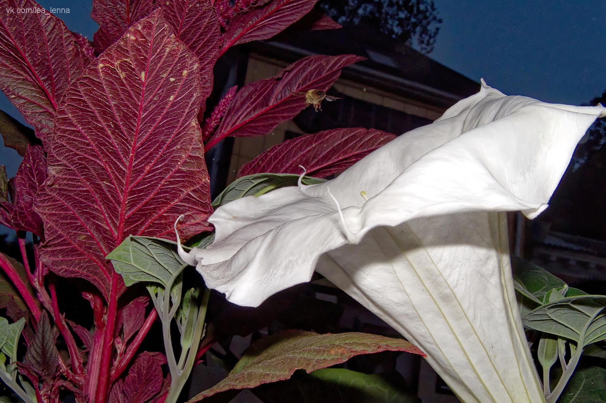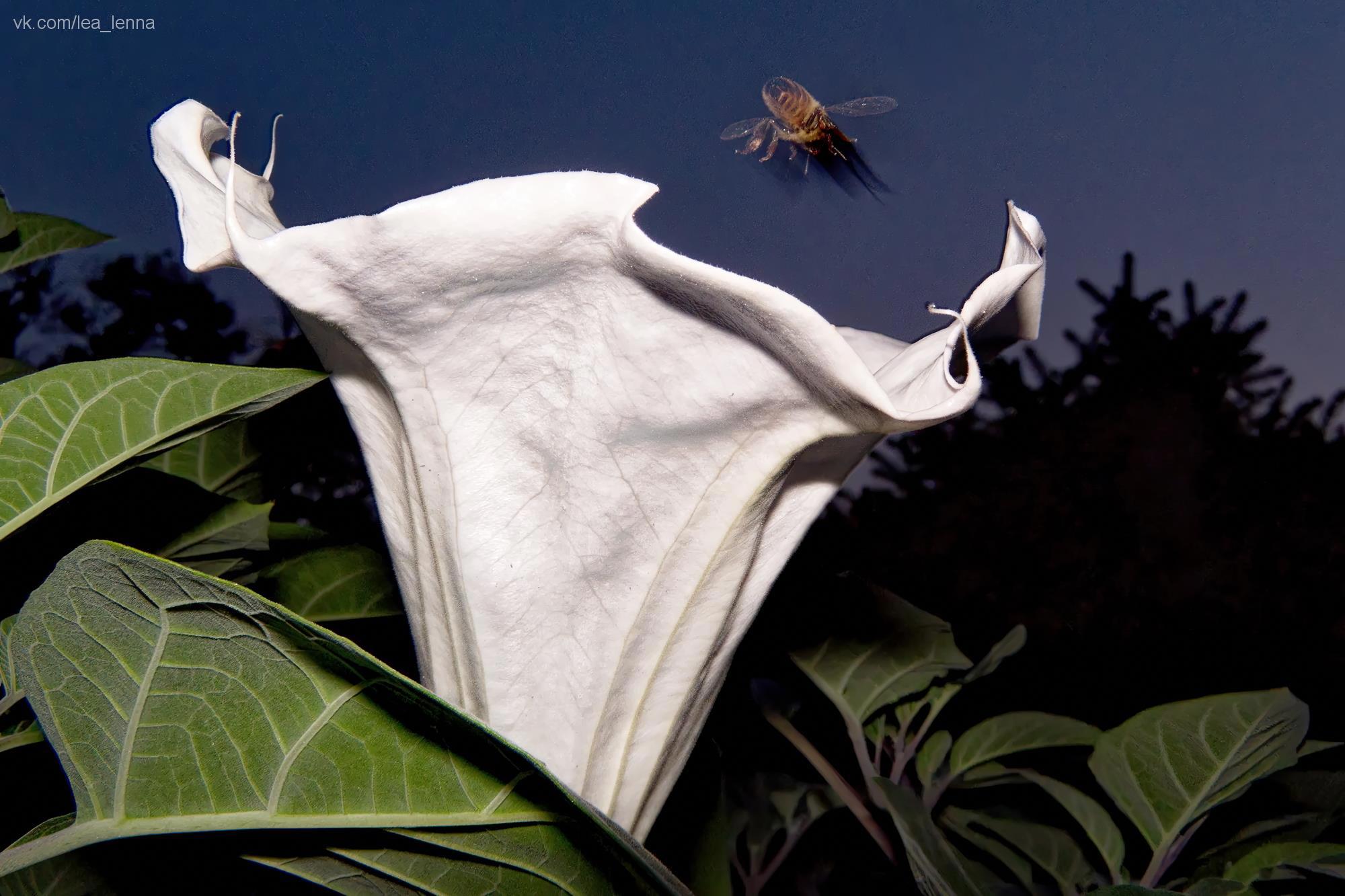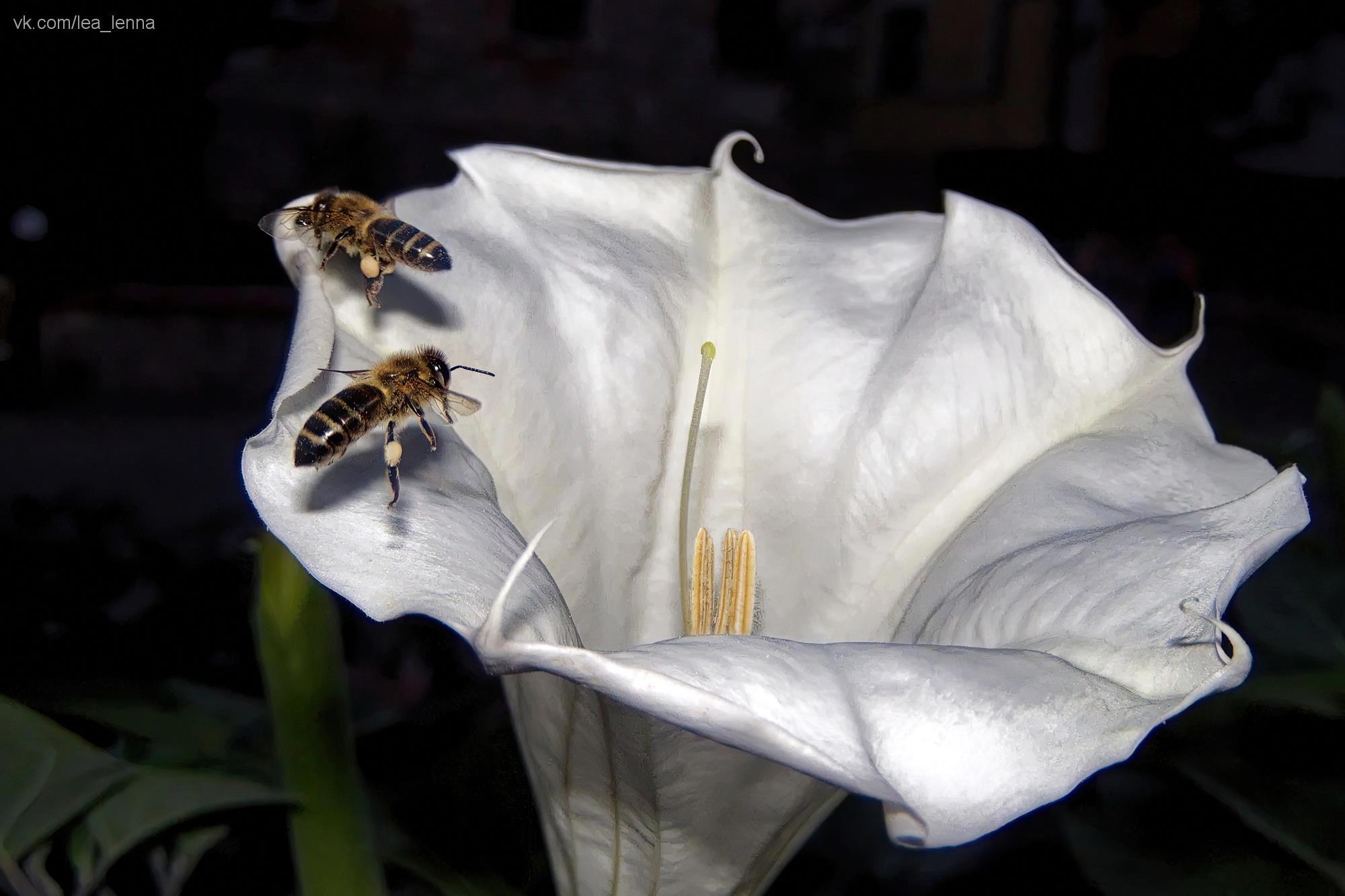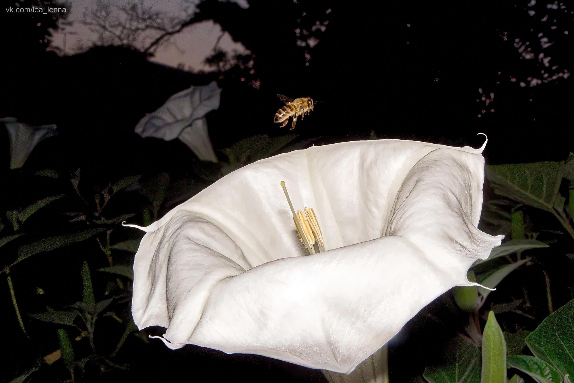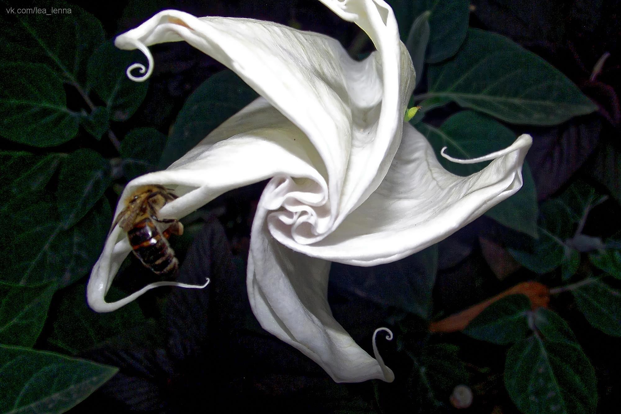 А кусты индийского дурмана невероятно красивы, усыпаны белыми или слегка фиолетовыми цветками огромной величины - диаметр граммофончика до 20 см и высота самого цветка такая же. К ночи цветки распускаются, разворачиваясь по спирали, и пчелы приступают к вечернему взятку. На одном снимке видно, как нетерпеливая пчела лапками раскрывает лепестки, чтобы попасть внутрь. А еще они очень сильно пахнут. Если пробовали держать в комнате лилии, то вот такой примерно запах - спать невозможно)). Когда я пару раз приносила домой цветки дурмана, чтобы всласть поснимать, то на ночь отправляла их в ванную, чтоб не уплыть, так сказать, в не те сны...