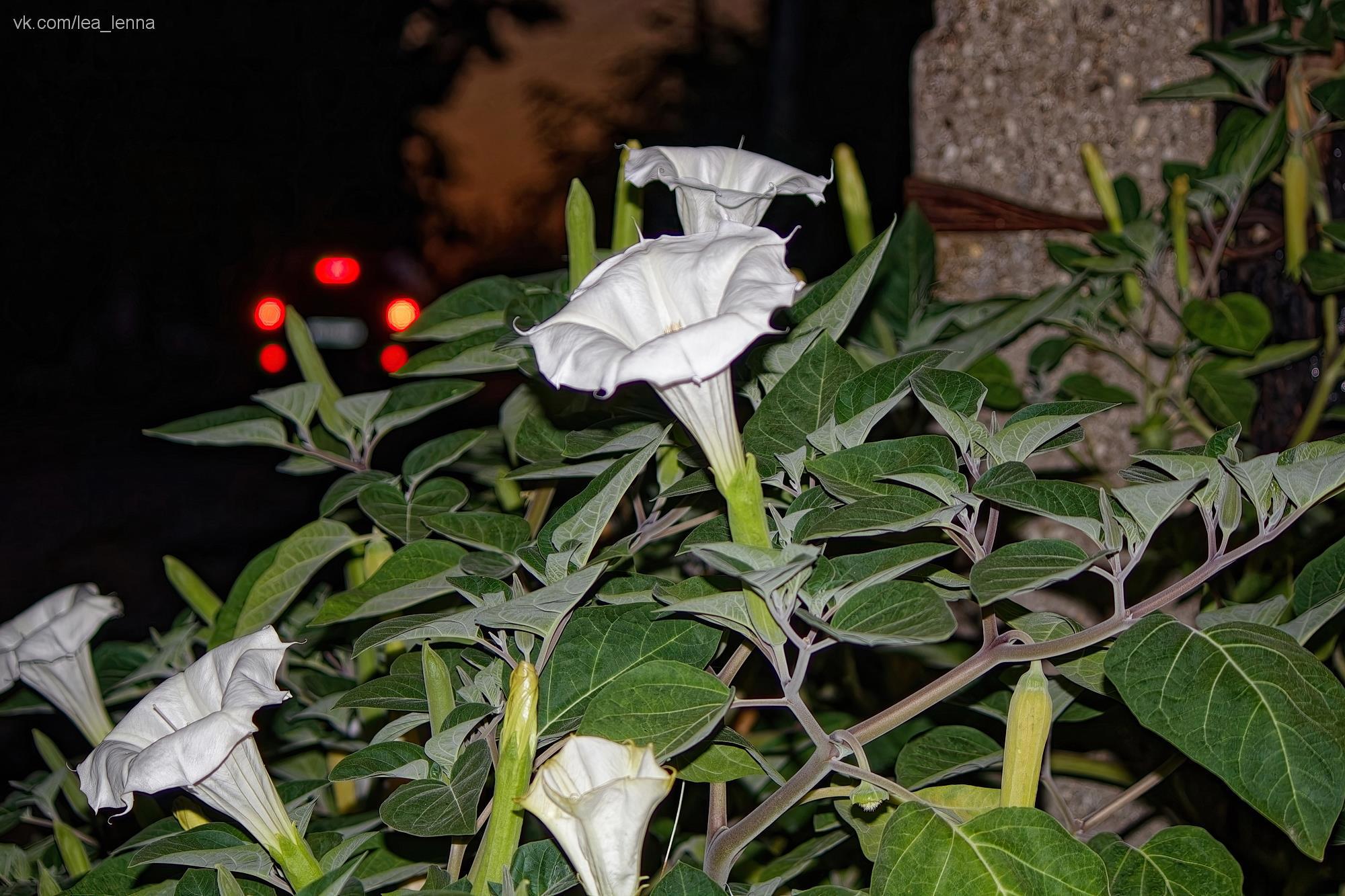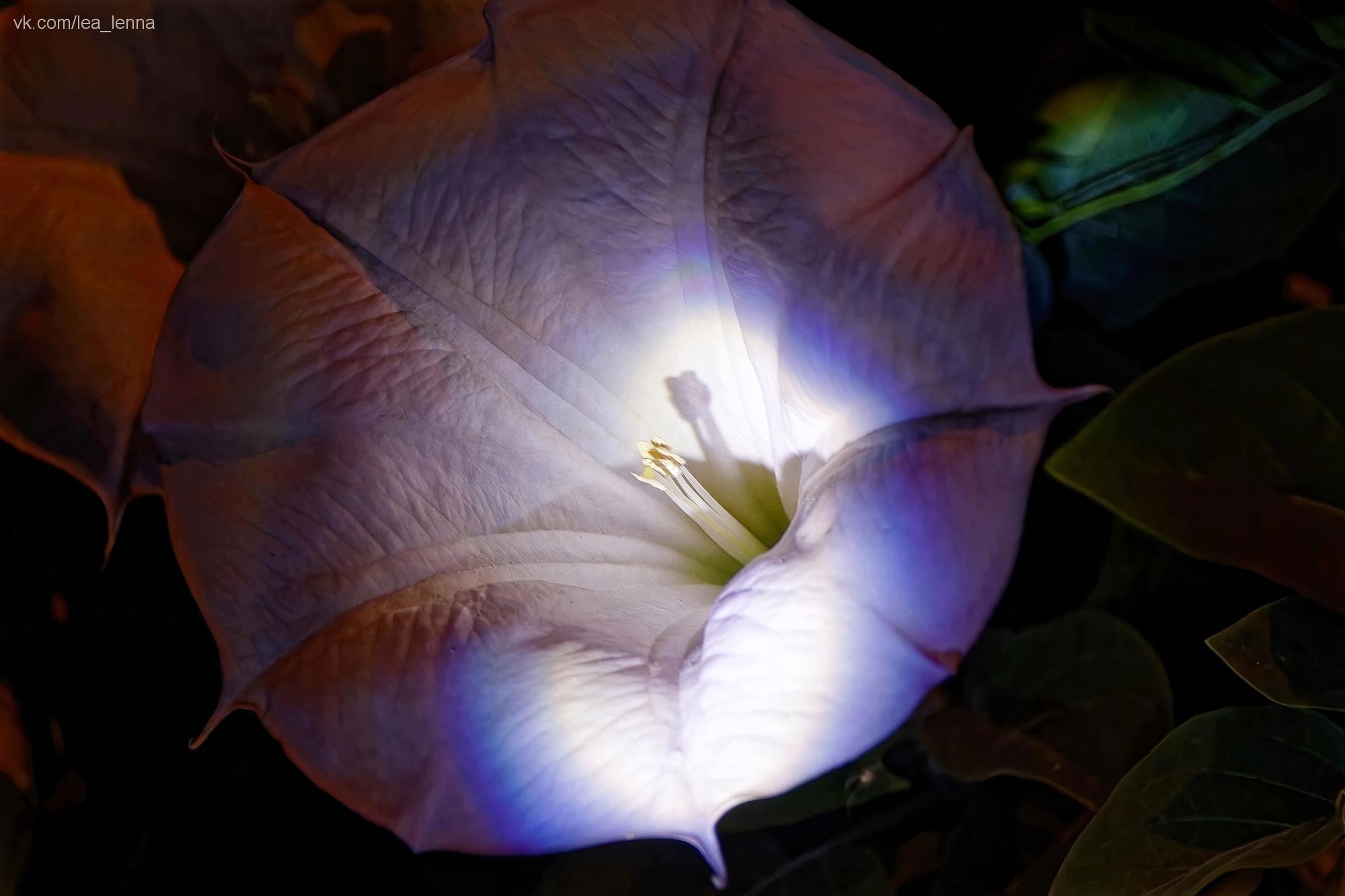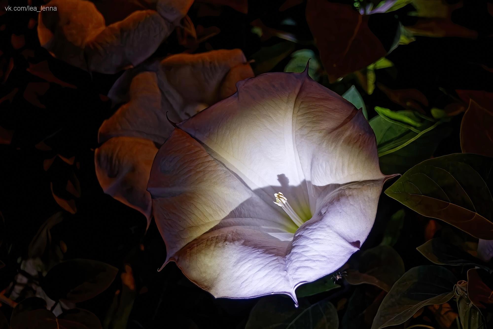 Снимать цветки дурмана очень увлекательно. Они крупные, и хотя чаще совсем белые, но очень скульптурные, словно вылепленные из воска, с интересными краешками-завитками. Если рядом какой-то свет, то белая поверхность преображается, превращаясь в тончайшие радуги разных оттенков. Ну и с лазерным фонариком, дающим множество ярких звездочек, я тоже побаловалась, превратив цветок в шляпу волшебника))).