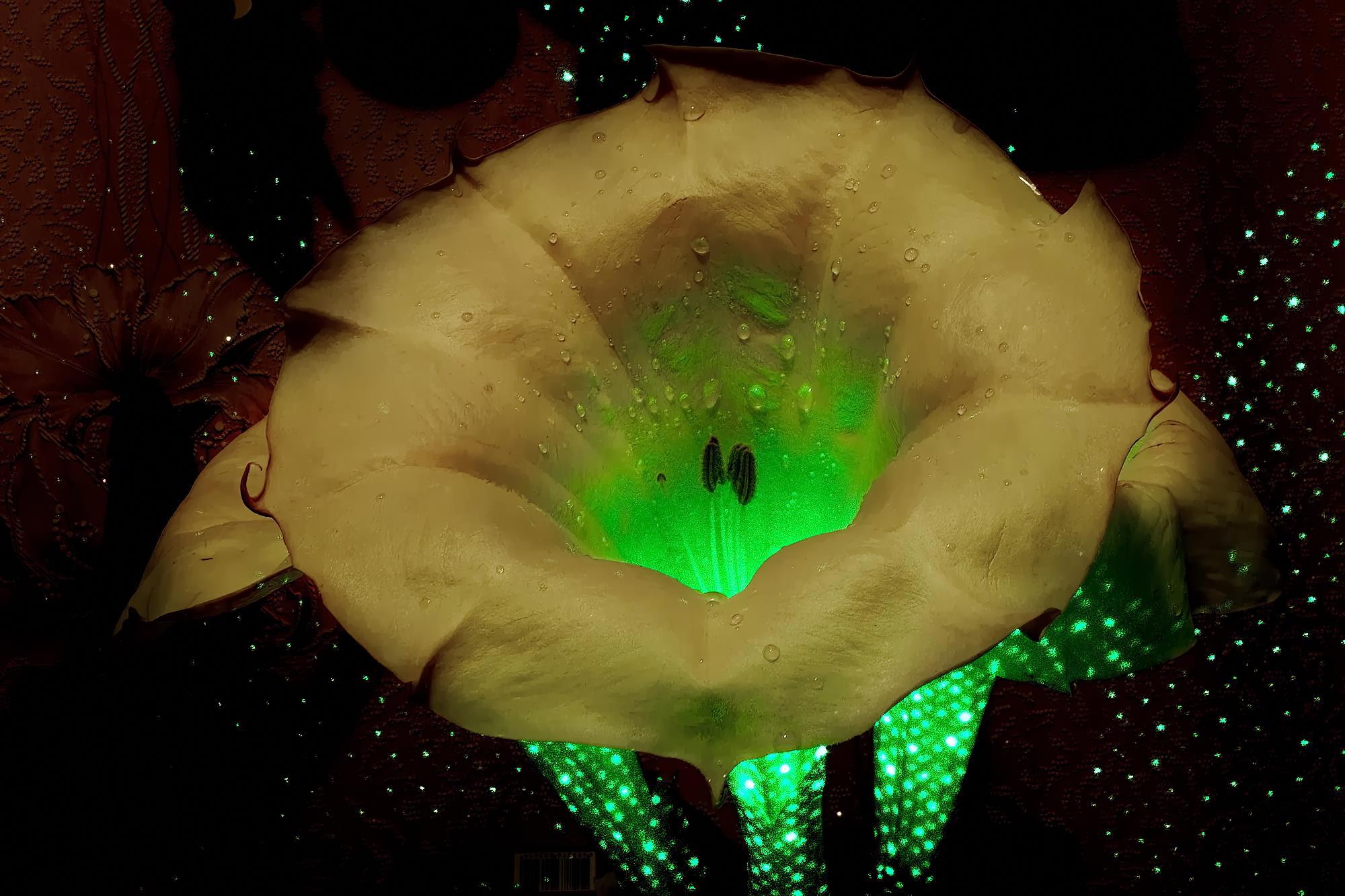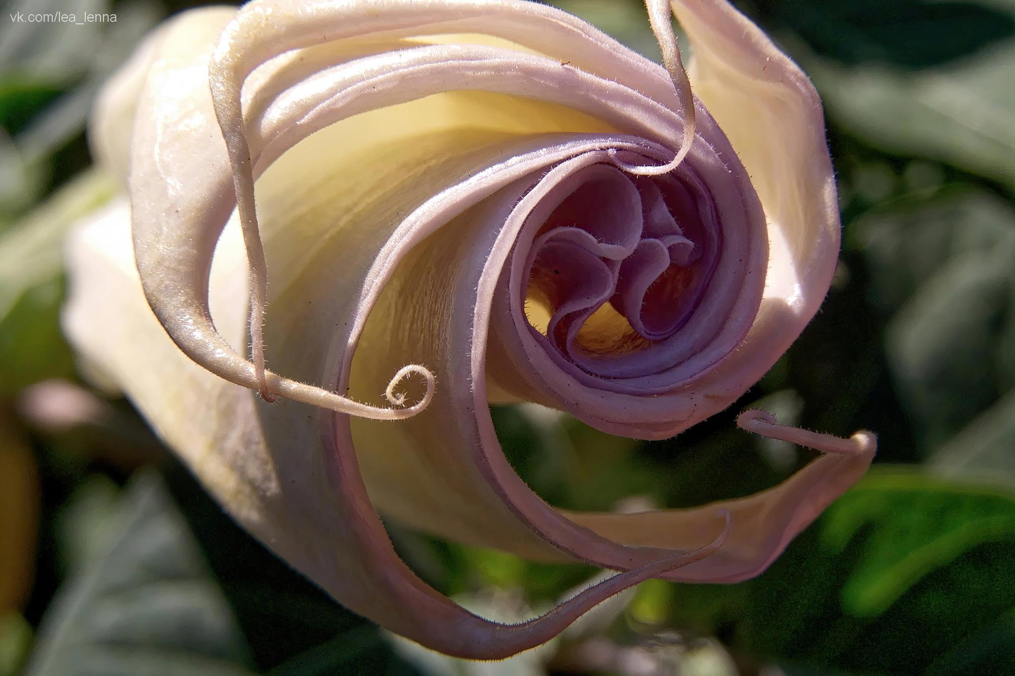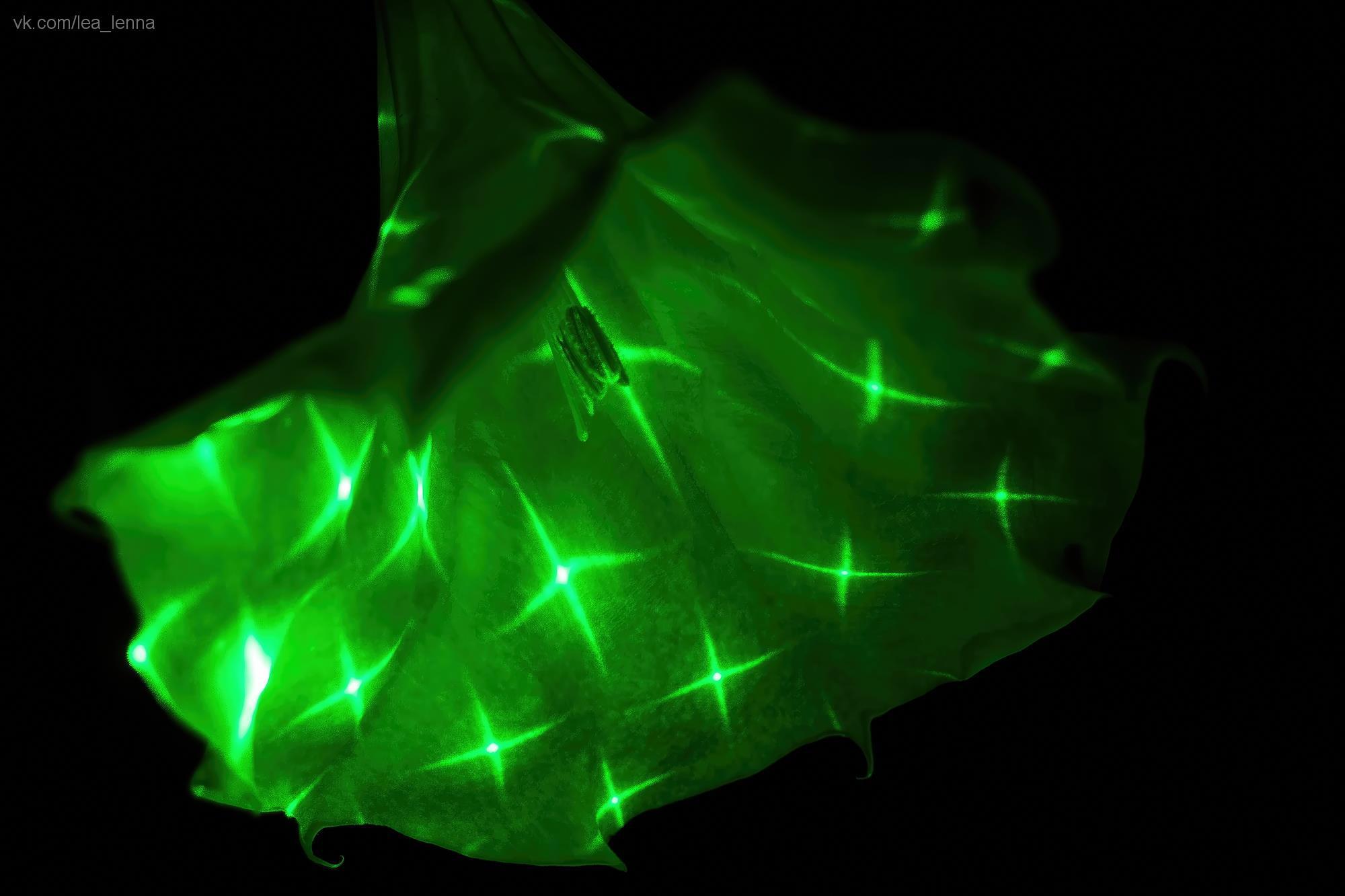 Снимать цветки дурмана очень увлекательно. Они крупные, и хотя чаще совсем белые, но очень скульптурные, словно вылепленные из воска, с интересными краешками-завитками. Если рядом какой-то свет, то белая поверхность преображается, превращаясь в тончайшие радуги разных оттенков. Ну и с лазерным фонариком, дающим множество ярких звездочек, я тоже побаловалась, превратив цветок в шляпу волшебника))).