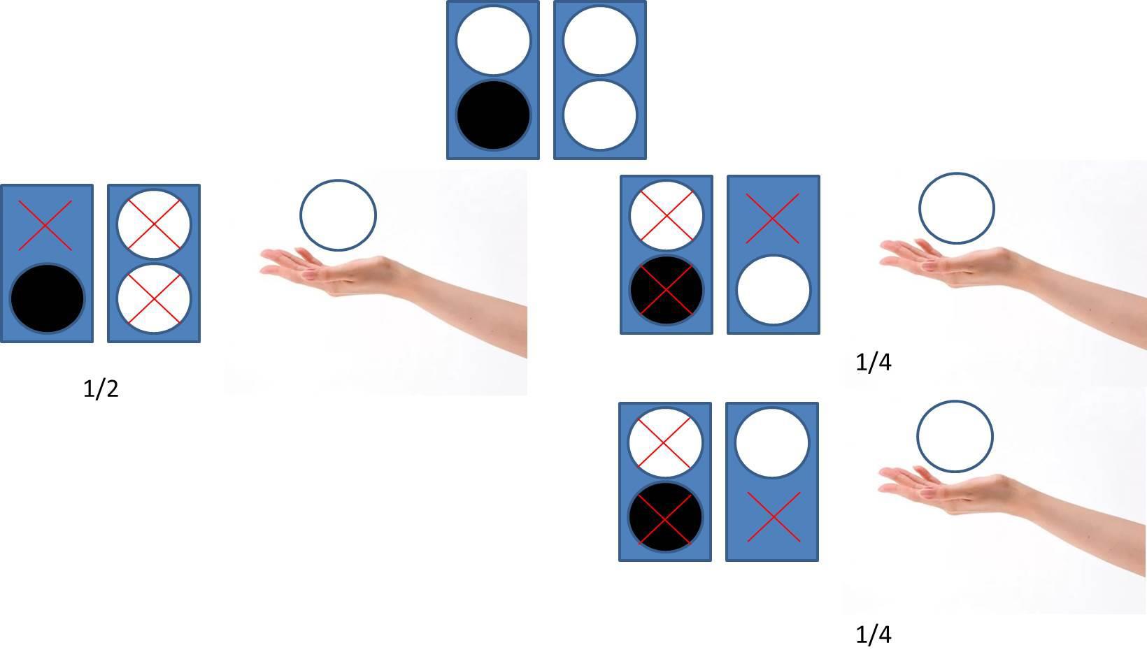 Апд2: еще один альтернативный вариант задачки, с дверями, доказывает, что у людей с придумыванием аналогов все-таки проблемы. Аналог, обыгрывающий условие с белым шаром, - это "в комнате 4 двери, две белых на левой стене ведут в комнату слева, белая и черная на правой ведут в комнату справа. В белую дверь можно войти, но она сразу закрывается, так что выходить надо из второй. Черная открывается только на выход. Броском монетки выбираешь левую или правую стену, в одну дверь заходишь, в другую выходишь. Какова вероятность, что выйдешь в центральную комнату из белой двери?".