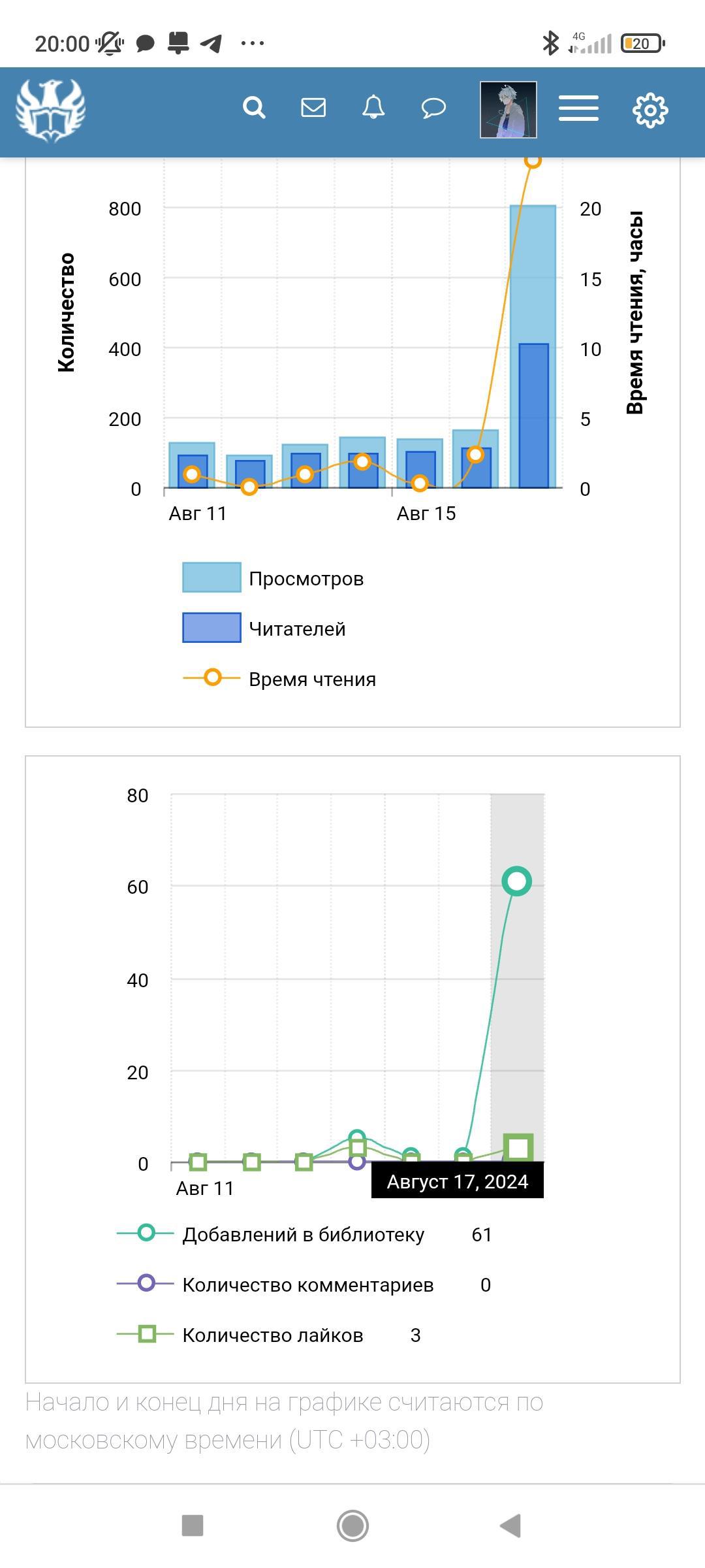 Автор: dredastralНарод! Значит я решил выпустить главу сегодня, и со спокойной душой решил пойти и передохнуть, потом заглянул на сайт и прихерел, тут сразу количество добавлений в библиотеку подскочили в два раза, и ещё 2 лайка накинули, да и читателей тоже нехило так навалило. Потом зашёл вечером, и по итогу, ну лучше смотрите сами. Для восстановленного фанфика а также низкой базы и популярности это довольно жирно. Спасибо что проявляете интереса к моему фанфику, и раз такой интерес, к следующей неделе выпущу новую главу :)