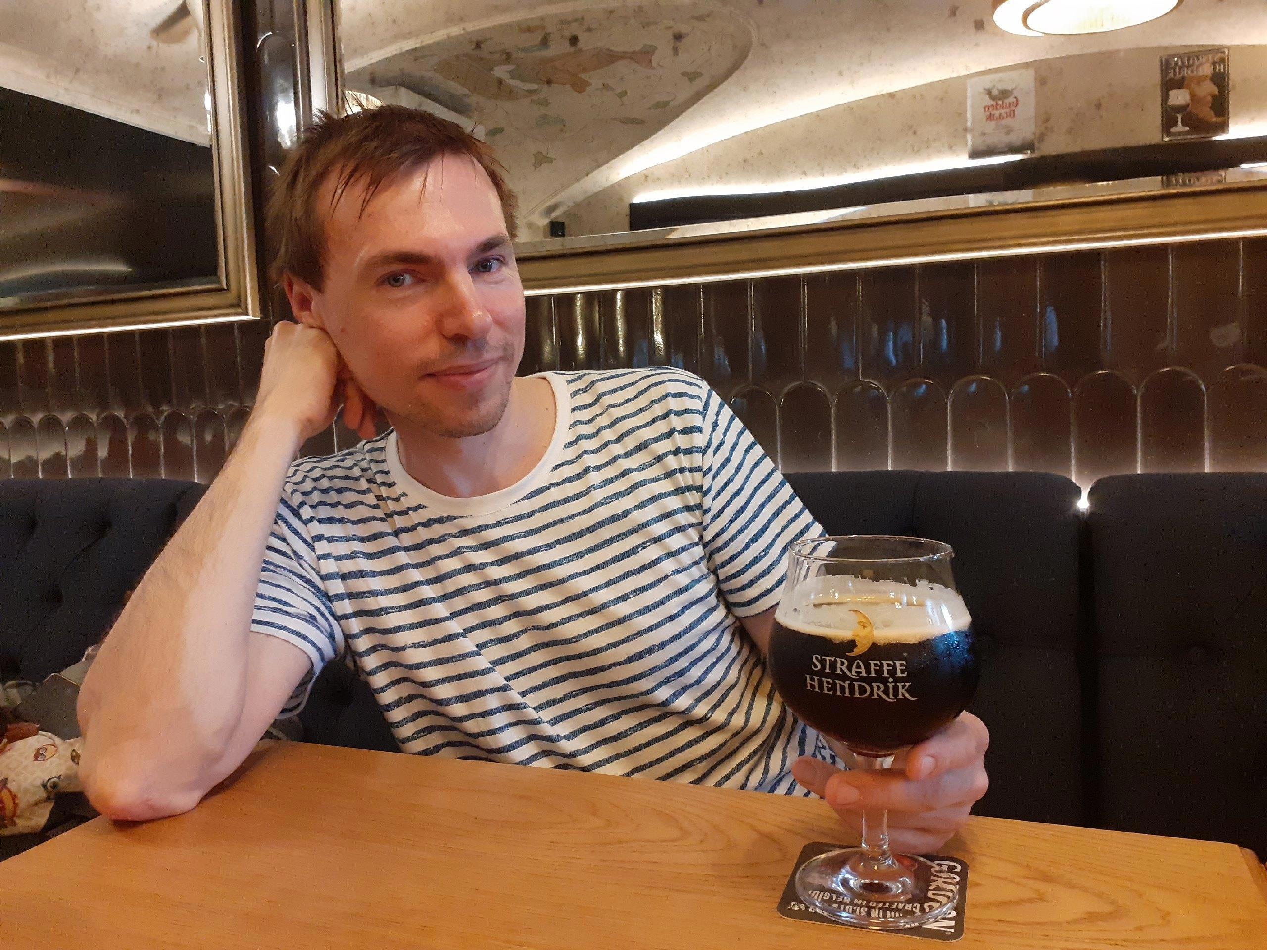 Довольная писательская физия с фирменный бокалом Straffe Hendrik Quadrupel