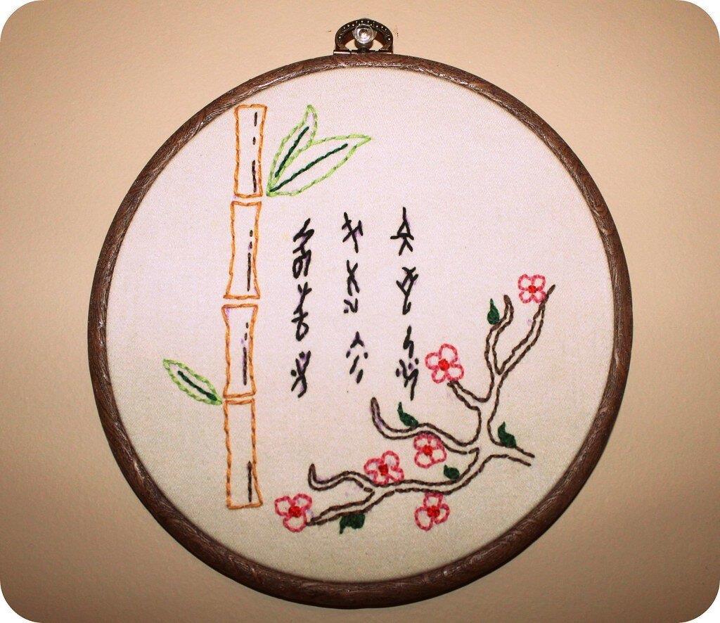А вот вышивка всегда была исконно женским занятием: вышивали не только рисунки, но и расписывали одежду письменами. Так от квадратного начертания традиционных иероглифов (тушью на бумаге) пришли к ромбовидному написанию иероглифов нитками на ткани. Их проще было изображать стежками на ткани.