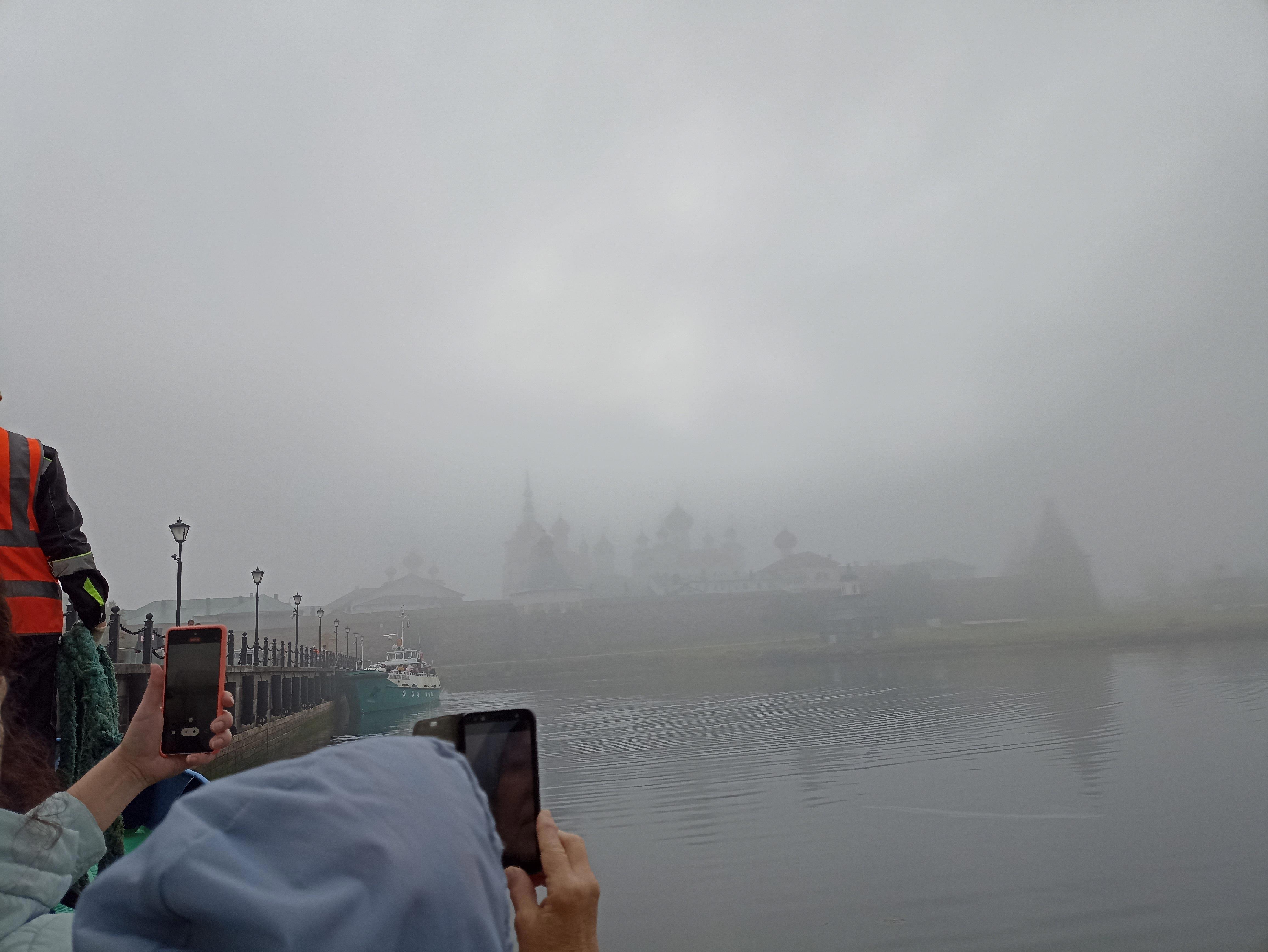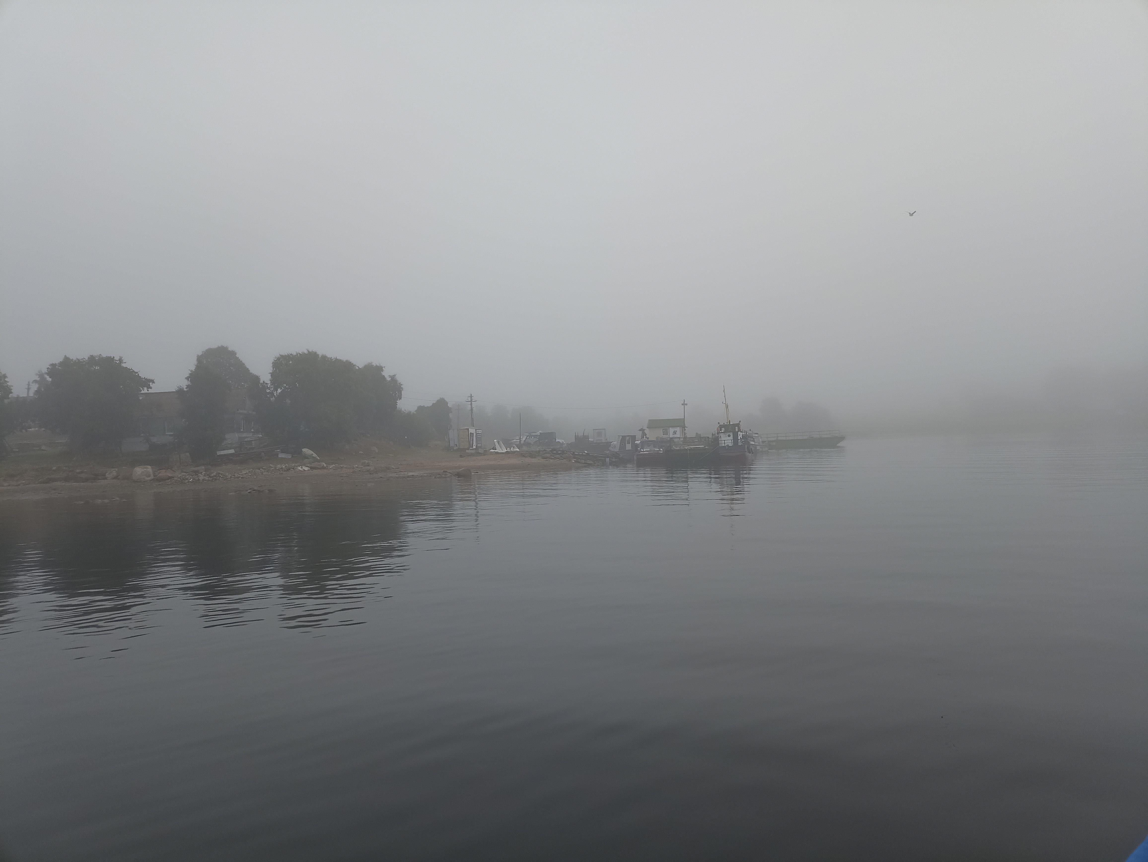 Поутру, часов в 7, Белое море реально белое: всё покрывает туман, и небо полностью сливается с водой.