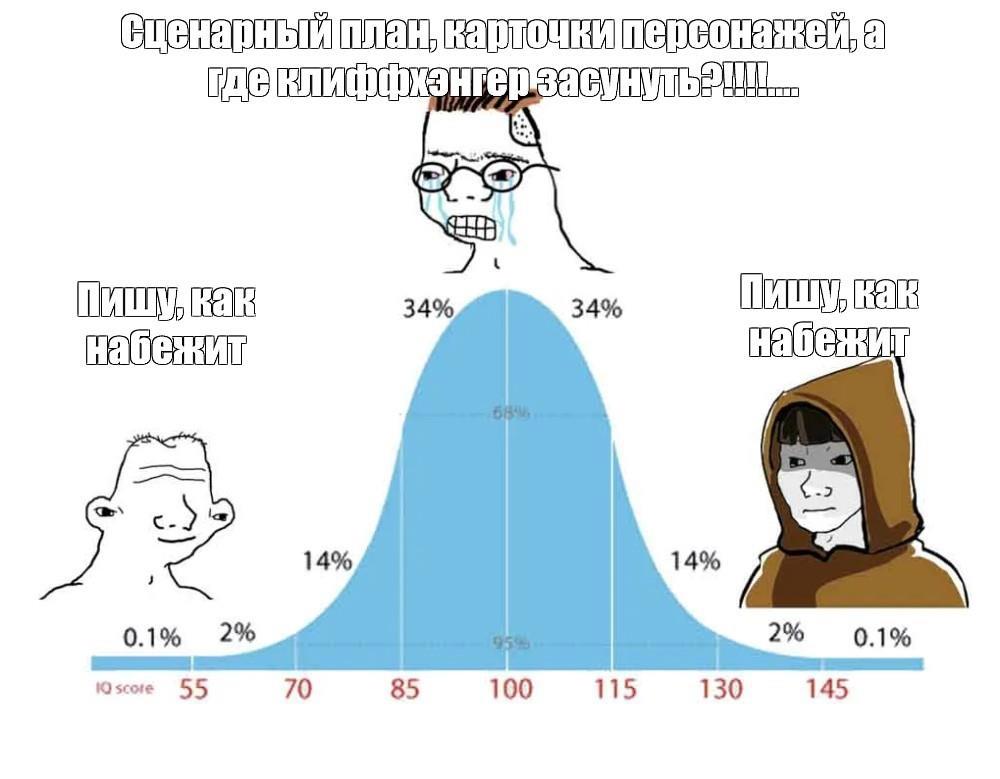 В этой картинке, правда, есть непредумышленная психологическая ловушка, заключающаяся в том, что из всех, кто пишет, как набежит, бесспорные 100% мысленно поместят себя в правой стороне графика (попытки спрятаться за самоиронией не засчитываются). И в результате суть мема опошлится до ну кто тут на нас с самим Сашкой Дюма сведения вольно текущей писанины к безусловному признаку познанного дзена. На практике же здесь нам в помощь другой мем, к которому я даже текст под случай приписывать не буду:
