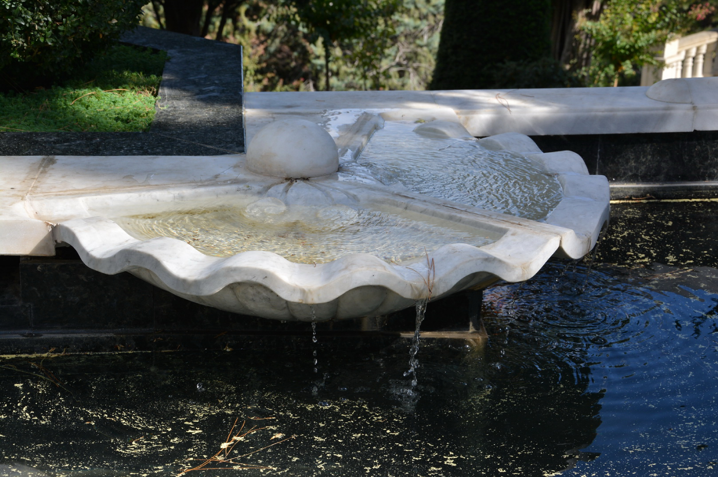 Спускаясь дальше, вы обнаружите в тенистом уголке прекрасный фонтан в виде раковины жемчужницы с белоснейжной жемчужиной. Здесь тоже можно посидеть, послушать тихое журчание струй воды, насладиться прохладой, так необходимой в знойный летний день.
