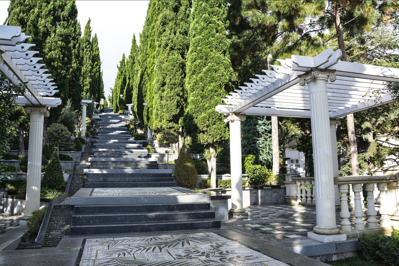 На всём пути вниз (или вверх, если вы рискнёте на подъём), вас ожидают тенистые уголки с прекрасными мозаичными площадками, мраморными скамейками и густыми кустарниками, которые создают ощущение уютного маленького дворика.
