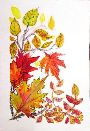 Но чёрно-белого рисунка, когда кругом яркие краски осени, мне мало. Нарисовала первую осеннюю открытку с листьями.
