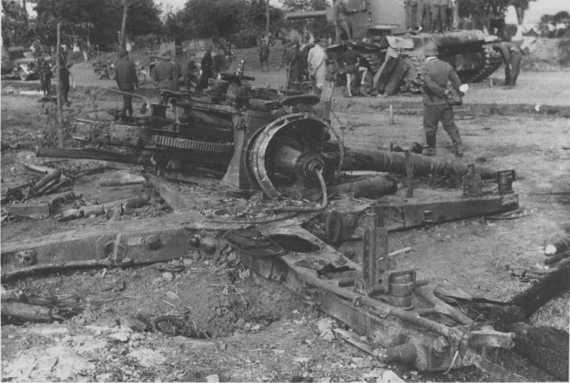 Понятно, что не в одни ворота игра шла. Раздавленная танком флак 8,8. Сзади справа - подбитый КВ-2