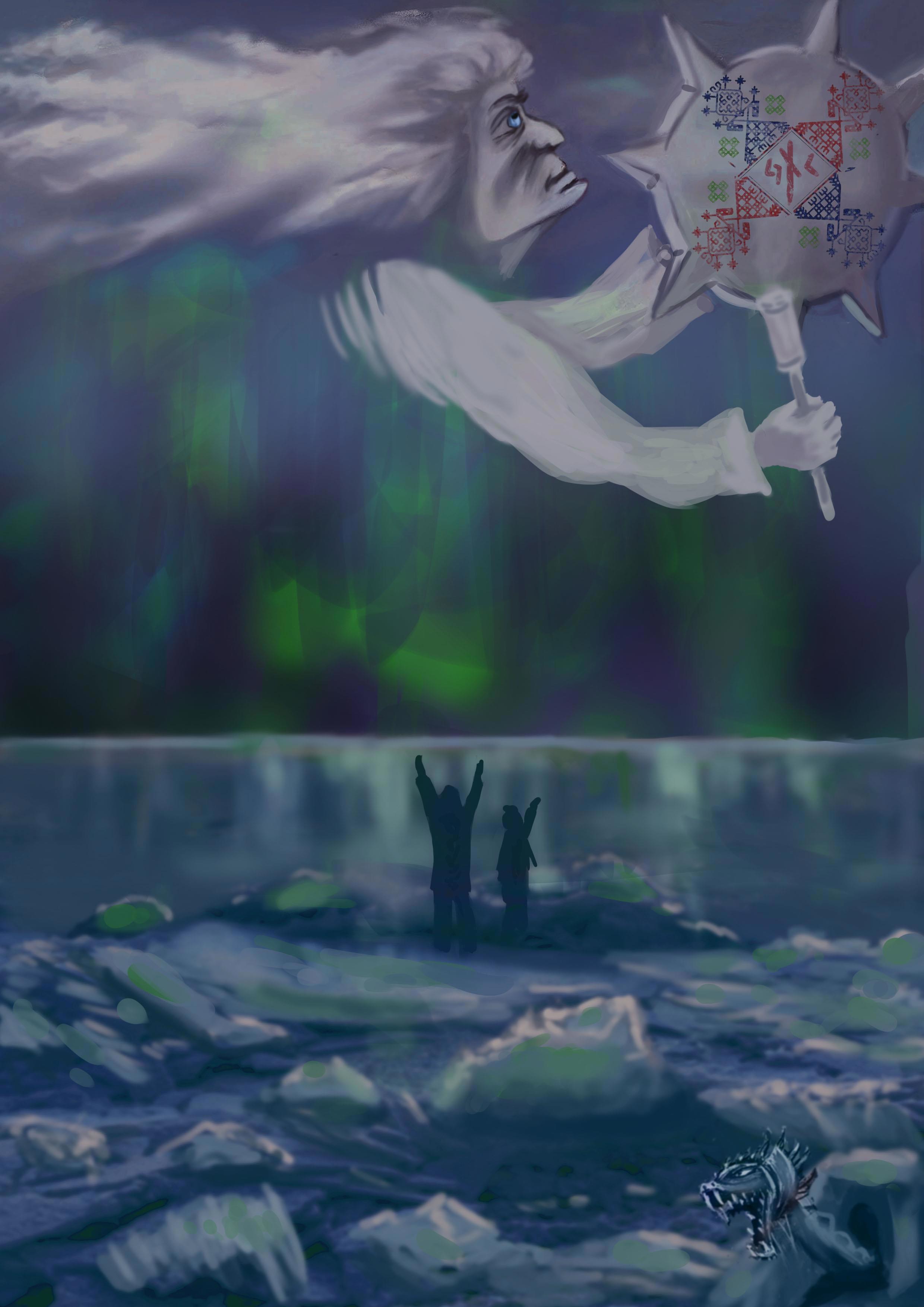На мой взгляд, здесь прекрасно раскрыта тема родного края, памяти предков и связи поколений. Наверху, по-видимому, - образ старой ведьмы Кайсы, среди торосов блуждают ее потомки и преемники Илья и Ян Лахтины, а на переднем плане выглядывает из-подо льда Водяной Змей.