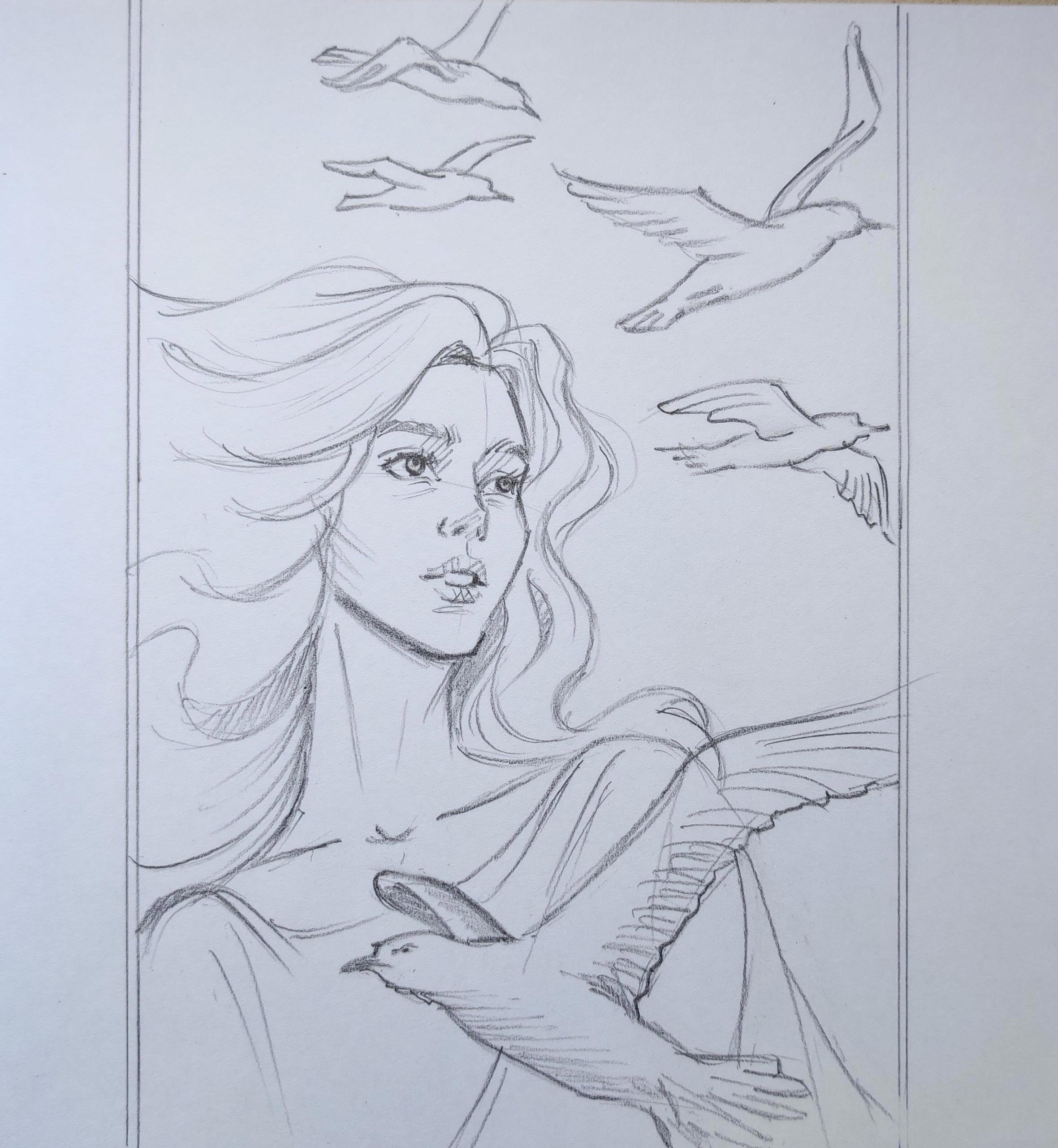 и нарисовать несколько иллюстраций к "Чайке с острова Мираколо", которые пока что существуют только в виде эскизов: