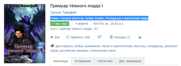 Во мне есть два читателя – один предпочитает что-то спокойное и размеренное, вроде бытового фэнтези, просто фэнтези и академок без любовных страданий, второй тянется к «движухе». Не секрет, что той же боярки на сайте много… И выделятся из массы можно по-разному, и как-то в поисках интересных книг я наткнулась на «Гримуар тёмного лорда I». Находится тут https://author.today/work/334020