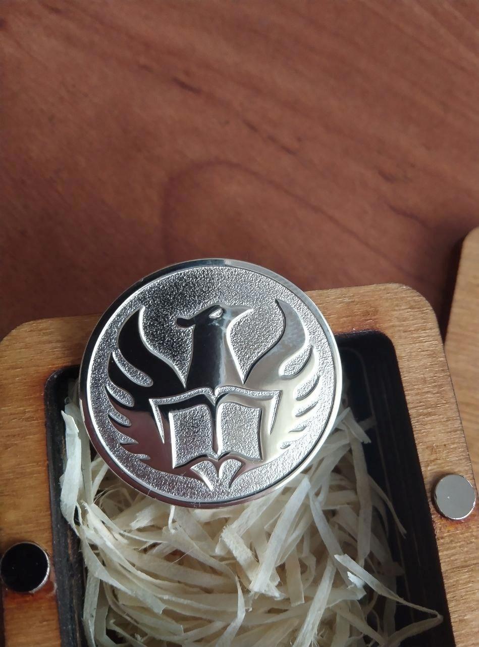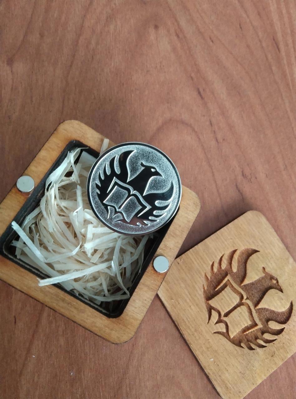 Выдается вот в такой коробочке из дерева с травленным рисунком на крышке.
