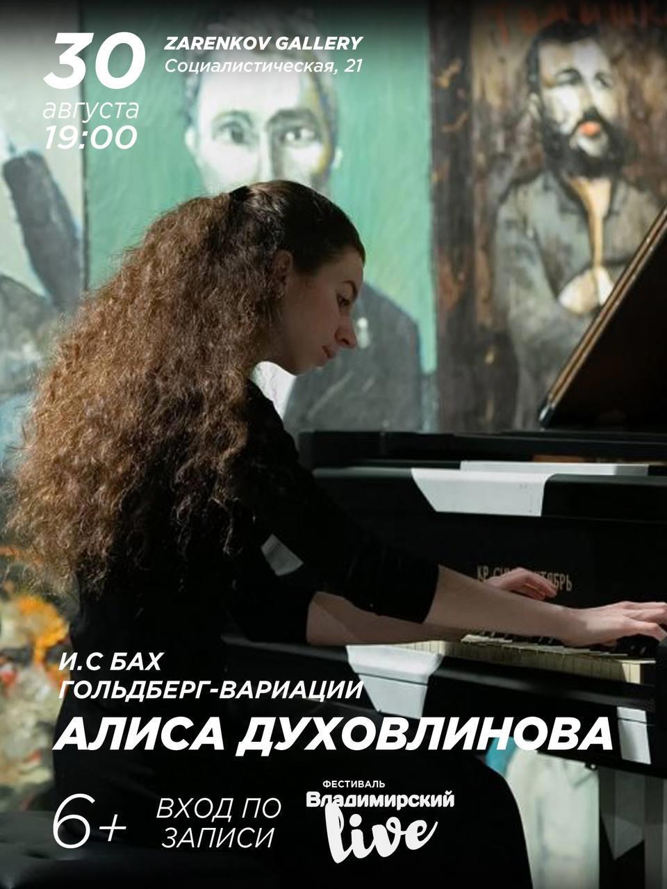 Уникальный концерт фортепианной музыки в исполнении Алисы ДУХОВЛИНОВОЙ состоится 30 августа в 19:00 в галерее ZARENKOV @Zarenkov Gallery, по адресу: