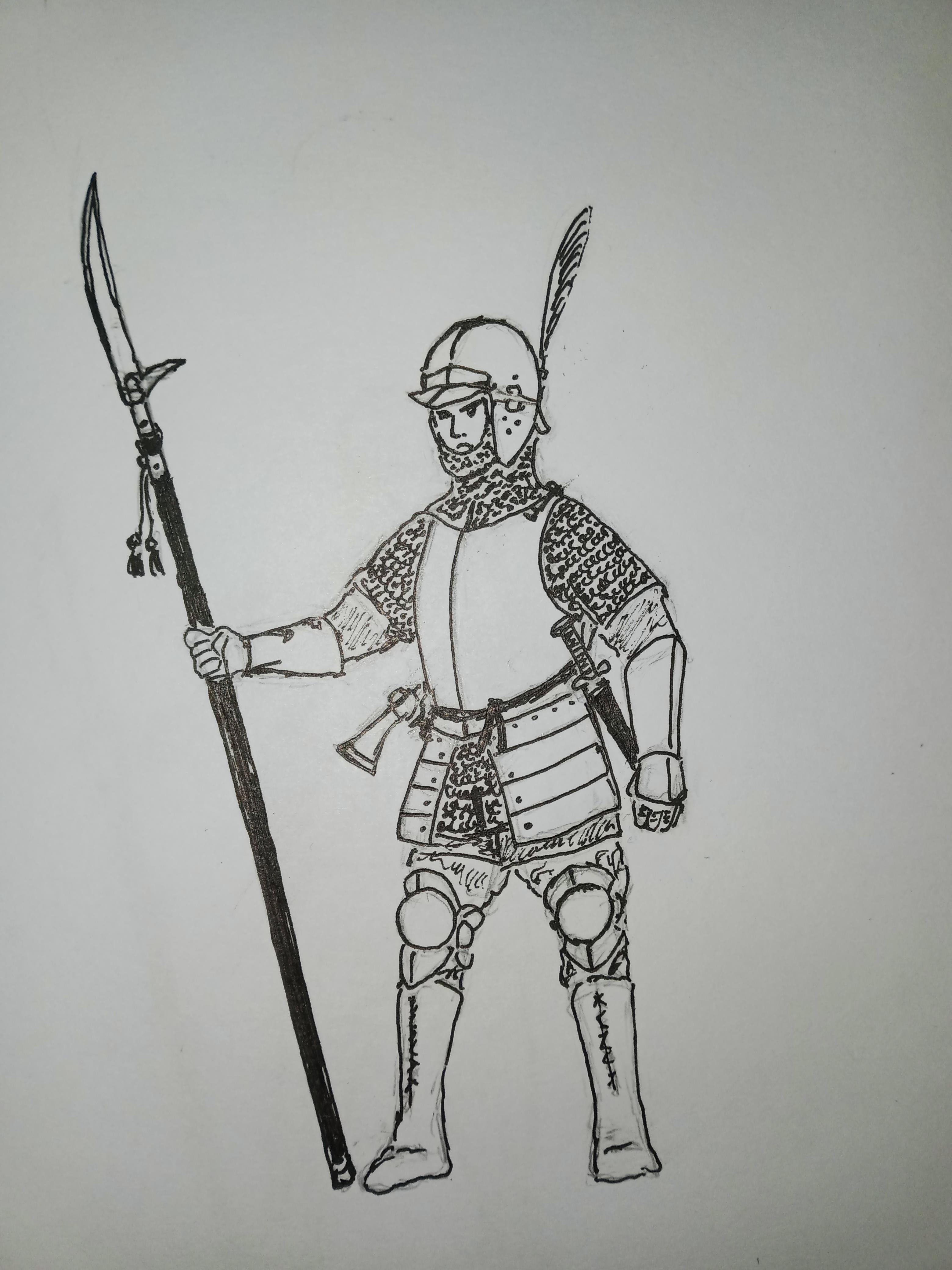 На первом рисунке изображен офицер кемийских федератов Союза. На нем кавалерийский шлем с полвижным козырьком, наушами и пластинчатой защитой шеи. Под шлемом кольчужный капюшон с подшлемником. Туловище защищает кираса. Наплечники и горжет, характерные для комплекса доспехов частей армии Союза отсутствуют, но видны пластинчатые набедренники. Под кирасой кольчуга с короткими рукавами и подолом до середины бедра, надетая поверх поддоспешной куртки. На руках латные перчатки, на ногах наколенники. На ногах форменные штаны и кемийские сапоги со шнуровкой. Вооружен офицер пальмой, причем скорее сделанной на заказ, потому как крупнее обычный кемийских и больше похожа на глефу, топором и кинжалом. На пальме шнуры определенного цвета и способа плетения - показатель принадлежности к конкретному роду.