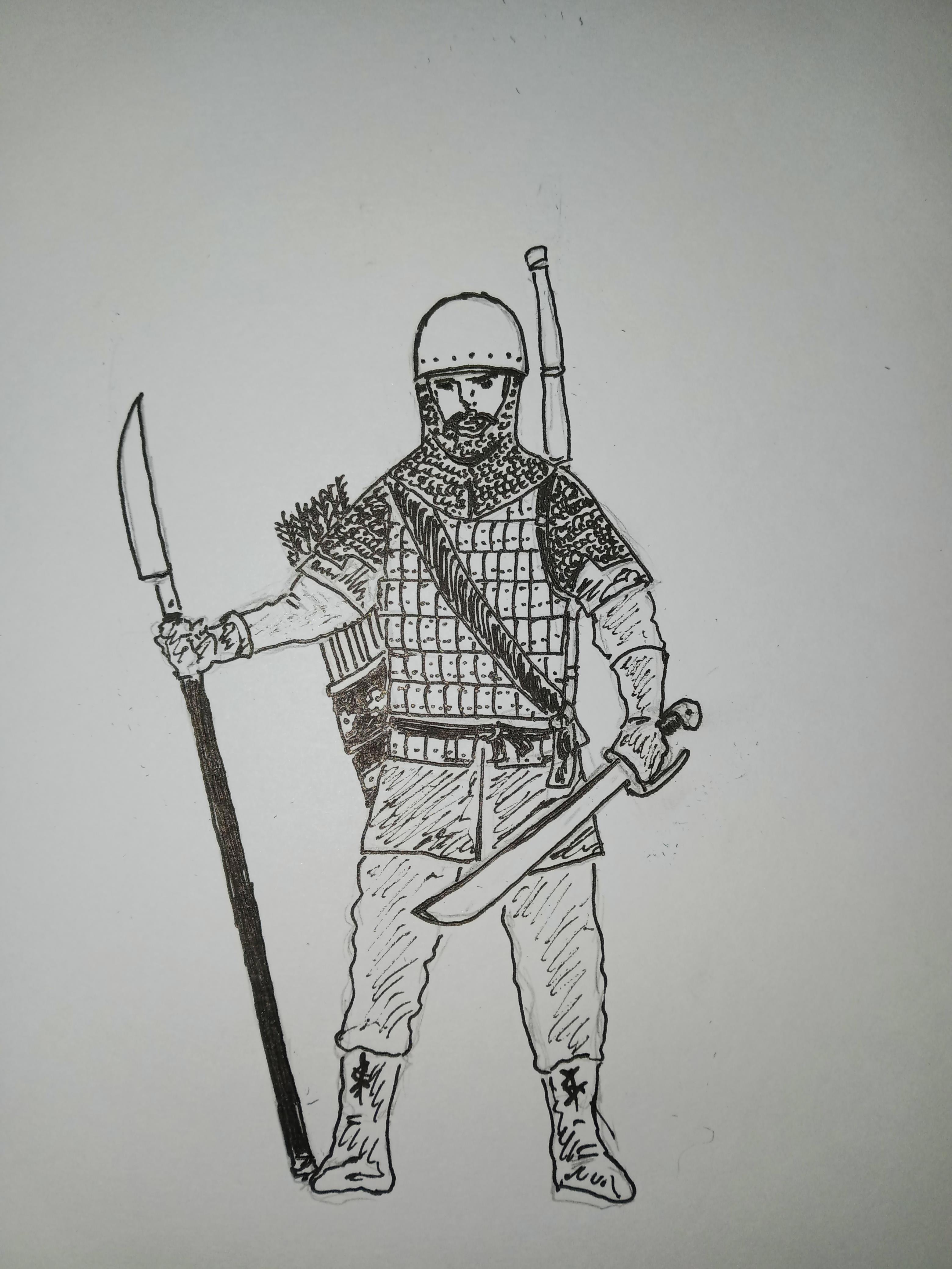 На втором рисунке показан просто кемийский воин-федерат. Его голову защищает простой полусферический шлем с приклепанной бармицей. Туловище закрывает пластинчатый доспех, скорее всего кемийской работы. Хотя, возможно, броня снята со скага. Нижний ряд пластин выполнен с разрезом. Под доспехом стеганая куртка с нашитым на воротнике, плечах, подмышках и подоле кольчужным полотном. Рукава у куртки обрезаны, т. е. не выданное снаряжение, а личное. Рубаха, штаны, руковицы и обувь кемийские. Поверх доспеха повязан кушак родовых цветов. Вооружен кемиец пальмой, тут она сильно скромнее офицерской и больше похожа на аналоги из нашего мира, тесаком и длинным луком. Лук в чехле за спиной, колчан справа сзади.