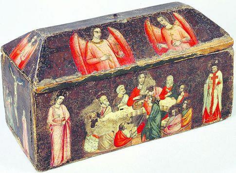 Это реликварий — шкатулка, в которой хранились мощи святого. Ханенко приобрел его на распродаже коллекции герцога Вердюра в 90-х годах XIX века. Согласно легенде, реликварий принадлежал монахам-францисканцам. Он расписан неизвестным мастером первой трети XIV века в манере Джотто — художника, которого называют родоначальником итальянской живописи. Реликварий прекрасно сохранился, даже медные застежки на нем — оригинальные.