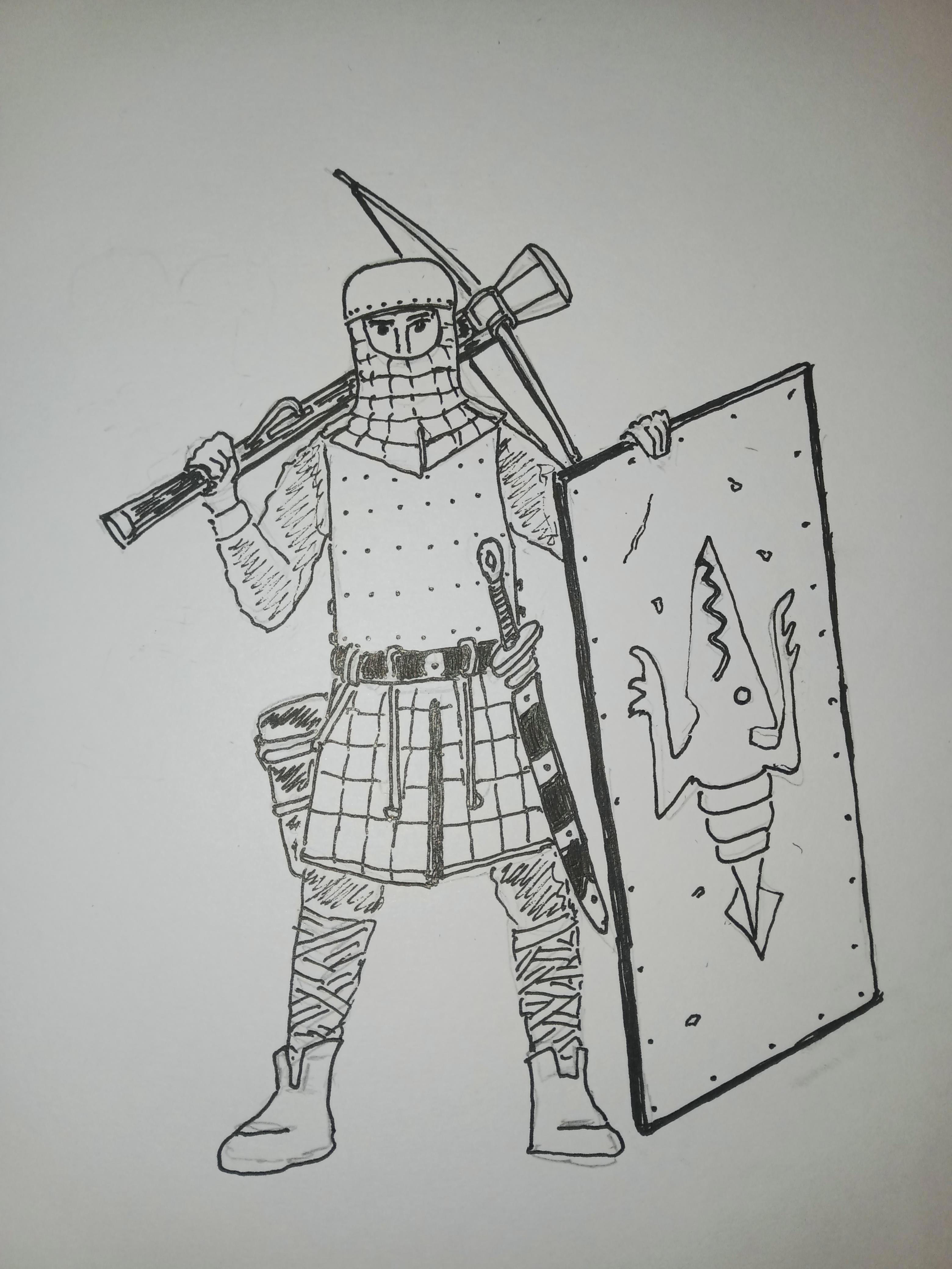 На арбалетчике простой шлем со стеганой защитой шеи и лица. Корпус защищает бригандина или как ее называют "панцирная куртка" без рукавов и подола. Она состоит из двух половин, соединяемых на плечах и по бокам корпуса. Бригандина надета поверх стеганного поддоспешника с длинными полами. Отдельной защиты конечностей нет. Арбалетчик снабжен большим ростоввм щитом. Вооружен стрелок, собственно, арбалетом и простым пехотным тесаком. На поясе крюки для натягивания тетивы и короб с болтами.
