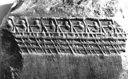 У нее было три яруса весел. На греческих биремах гребцу верхнего яруса размещались не так, как на финикийских судах,— здесь они сидели в специальных гнездах, над бортами (вспомните Нику Самофракийскую из Лувра, установленную именно в таком гнезде в носовой части биремы). Таким же образом построена триера. Барельеф из Акроголя в Афинском музее помогает понять конструкцию триер: экипаж третьего яруса состоял из 31 гребца, второго яруса — из 27, первый, межпалубный ярус вмещал 27 человек. Весла второго и третьего ярусов двигались на осях-уключинах. Весла первого нижнего яруса проходили сквозь лючки в бортах, и эти лючки герметизировались манжетами из кожи. Такое судно имело в длину 36 м, в ширину 6 м, глубина осадки составляла 1 метр. Итак, оно было низким, длинным и заостренным, но у него хватало мощности, чтобы пробить корпус противника. У монеры таран имел форму головы дельфина, у триеры он состоял из 2-3 острых наконечников шпагообразной формы. На некоторых триерах ставили железные рогатины над тараном для разрушения надводного борта атакуемого судна.