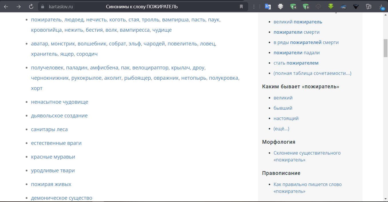 Название я выбрал "Пожиратель", но поскольку уже куча произведений имела такое название, я пошел искать синонимы. Ну, мол, а вдруг есть какой-то вычурный синоним, дабы хоть немного приободрить самолюбие. В итоге ничего такого я не нашел, но сайт "карта слов" прямо долбанул по глазам. Я будто бы открыл оглавление какого то жутко интересного мрачного фэнтези, и лавина образов захлестнула мозг))) Честно говоря я такое бы почитал))) Ну, собственно увидев скрин, думаю почувствуете то же самое
