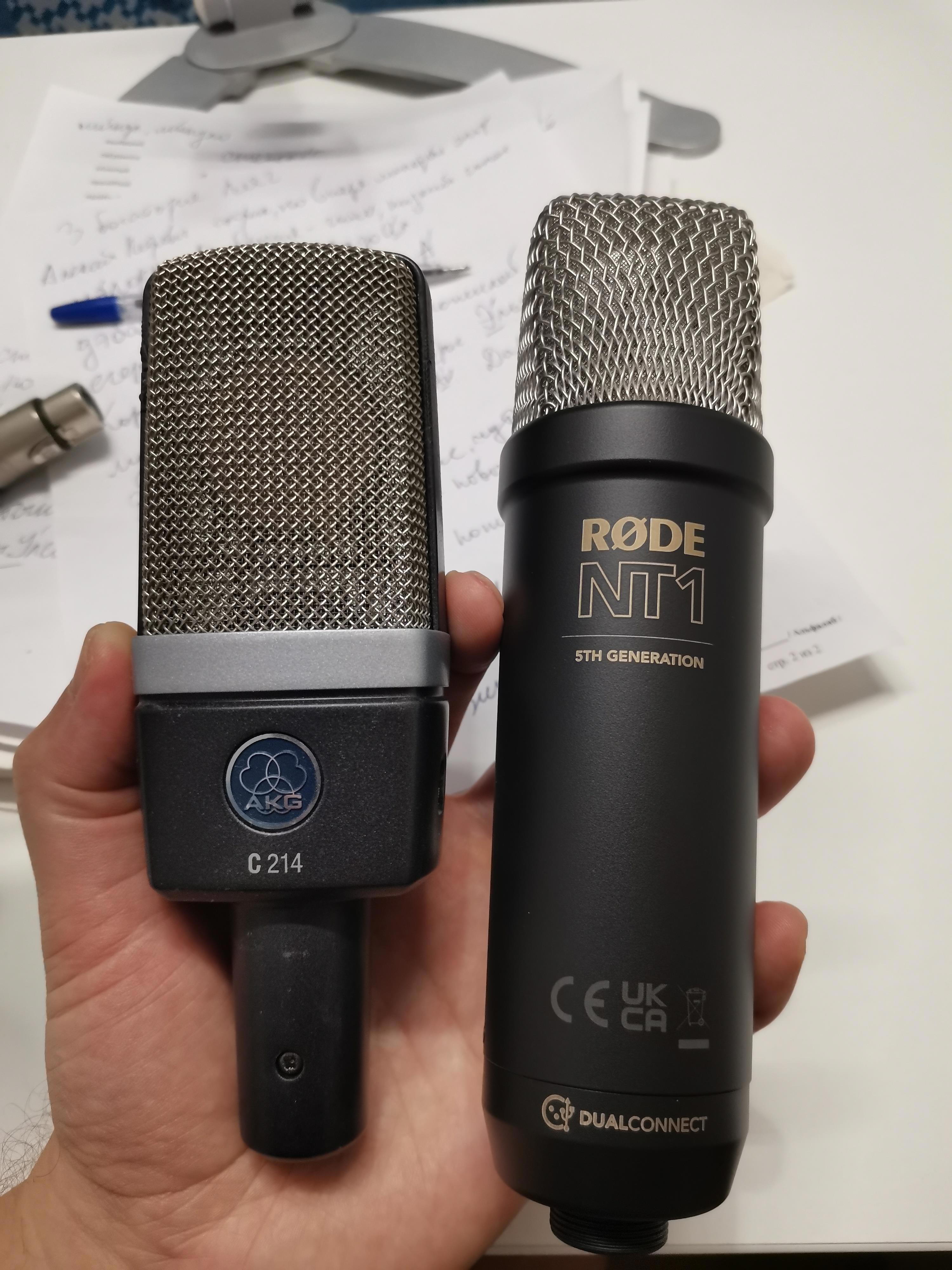 Мой микрофон, в который я озвучиваю с 2018 года и пока еще доделываю в него все текущие проекты, - добротная рабочая лошадка AKG C214 (на фото слева). Такой малыш по сравнению с новым рабочим конём Rode nt1 5 generation (на фото справа). Звучит абсолютно как новый (можно оставить пока запасным), но время оставило свои следы - красочка на корпусе начала истираться.