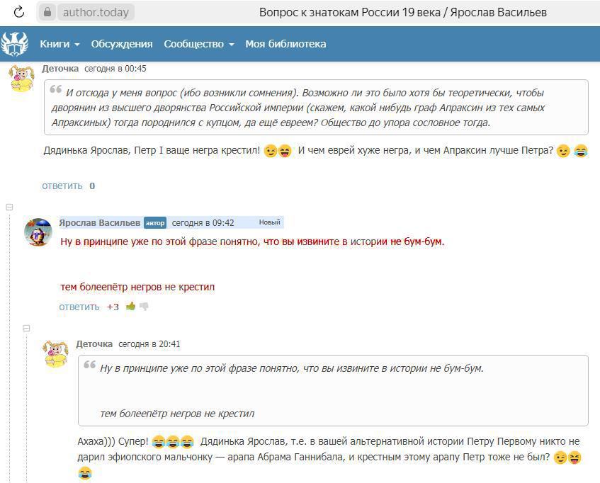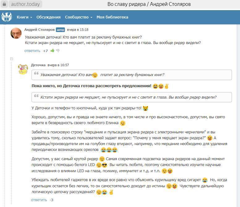 Тогда Деточка посоветовала почитать научные статьи по определенной теме и, по всей видимости, дядинька Столяров почитал, поэтому на этот коммент Деточки ничего не ответил https://author.today/post/539182?c=27604446&th=27595107