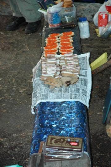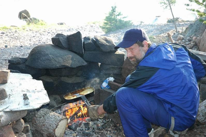 А это я пеку оладьи. Давным-давно взял на себя добровольную обязанность -- хоть разок в походе, да испечь. Со сгущенкой, перемешанной с давленой черникой (фиолетовая такая смесь, по мнению некоторых, не совместимая с понятием "еда") -- самое то. Идет на ура.