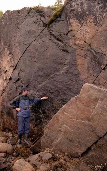 А где взять чистую воду? В реке -- понятно, а на Белом море? Например, здесь. Вот она, стекает тонким слоем со скалы. Наверху -- верховое болотце. Вода, процеженная через сфагнум, очень чистая и вкусная.