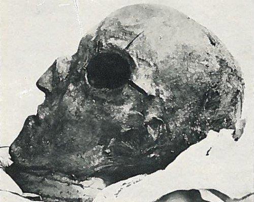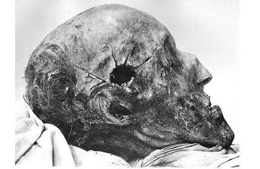 Красиво прилетает, надо заметить - мумия короля отлично это показывает. Входное отверстие в правом виске